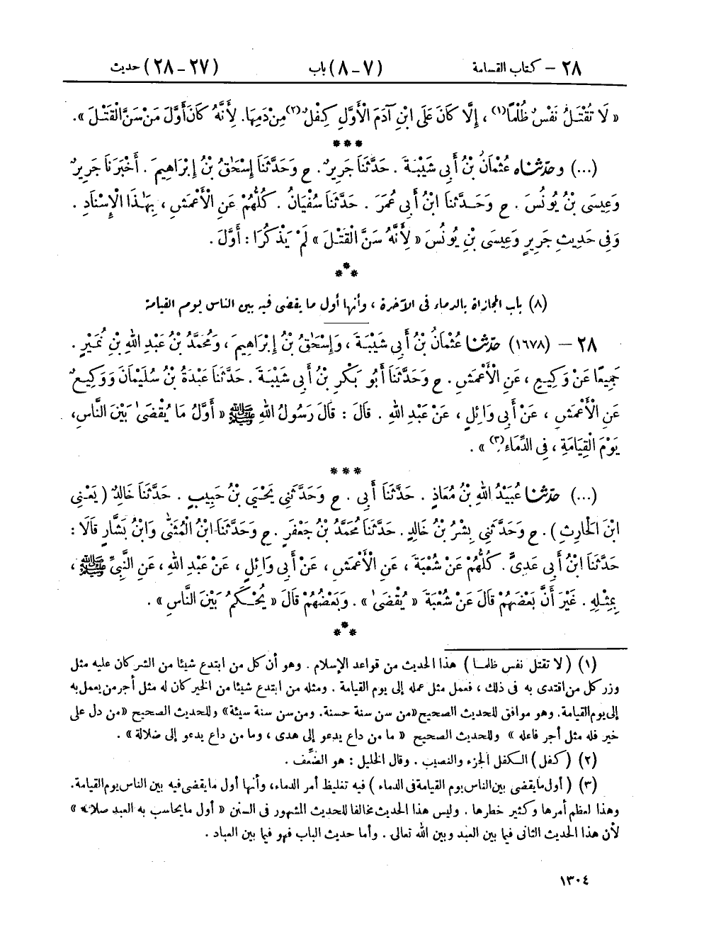 ٢٨ - (١٦٧٨) حَدَّثَنَا عُثْمَانُ بْنُ أَبِي شَيْبَةَ، وَإِسْحَاقُ بْنُ إِبْرَاهِيمَ، وَمُحَمَّدُ بْنُ عَبْدِ اللهِ بْنِ نُمَيْرٍ، جَمِيعًا عَنْ وَكِيعٍ، عَنِ الْأَعْمَشِ، ح وحَدَّثَنَا أَبُو بَكْرِ بْنُ أَبِي شَيْبَةَ، حَدَّثَنَا عَبْدَةُ بْنُ سُلَيْمَانَ، وَوَكِيعٌ، عَنِ الْأَعْمَشِ، عَنْ أَبِي وَائِلٍ، عَنْ عَبْدِ اللهِ، قَالَ: قَالَ رَسُولُ اللهِ صَلَّى اللهُ عَلَيْهِ وَسَلَّمَ: «أَوَّلُ مَا يُقْضَى بَيْنَ النَّاسِ يَوْمَ الْقِيَامَةِ فِي الدِّمَاءِ»،