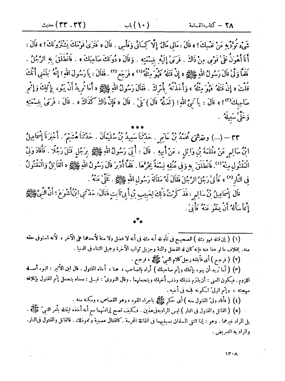 ٣٣ - (١٦٨٠) وحَدَّثَنِي مُحَمَّدُ بْنُ حَاتِمٍ، حَدَّثَنَا سَعِيدُ بْنُ سُلَيْمَانَ، حَدَّثَنَا هُشَيْمٌ، أَخْبَرَنَا إِسْمَاعِيلُ بْنُ سَالِمٍ، عَنْ عَلْقَمَةَ بْنِ وَائِلٍ، عَنْ أَبِيهِ، قَالَ: أُتِيَ رَسُولُ اللهِ صَلَّى اللهُ عَلَيْهِ وَسَلَّمَ بِرَجُلٍ قَتَلَ رَجُلًا، فَأَقَادَ وَلِيَّ الْمَقْتُولِ مِنْهُ، فَانْطَلَقَ بِهِ وَفِي عُنُقِهِ نِسْعَةٌ يَجُرُّهَا، فَلَمَّا أَدْبَرَ، قَالَ رَسُولُ اللهِ صَلَّى اللهُ عَلَيْهِ وَسَلَّمَ: «الْقَاتِلُ وَالْمَقْتُولُ فِي النَّارِ»، فَأَتَى رَجُلٌ الرَّجُلَ، فَقَالَ لَهُ مَقَالَةَ رَسُولِ اللهِ صَلَّى اللهُ عَلَيْهِ وَسَلَّمَ، فَخَلَّى عَنْهُ قَالَ إِسْمَاعِيلُ بْنُ سَالِمٍ: فَذَكَرْتُ ذَلِكَ لِحَبِيبِ بْنِ أَبِي ثَابِتٍ فَقَالَ: حَدَّثَنِي ابْنُ أَشْوَعَ أَنَّ النَّبِيَّ صَلَّى اللهُ عَلَيْهِ وَسَلَّمَ إِنَّمَا سَأَلَهُ أَنْ يَعْفُوَ عَنْهُ فَأَبَى