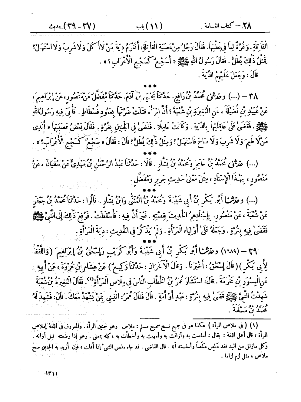 ٣٨ - (١٦٨٢) وحَدَّثَنِي مُحَمَّدُ بْنُ رَافِعٍ، حَدَّثَنَا يَحْيَى بْنُ آدَمَ، حَدَّثَنَا مُفَضَّلٌ، عَنْ مَنْصُورٍ، عَنْ إِبْرَاهِيمَ، عَنْ عُبَيْدِ بْنِ نُضَيْلَةَ، عَنِ الْمُغِيرَةِ بْنِ شُعْبَةَ، أَنَّ امْرَأَةً قَتَلَتْ ضَرَّتَهَا بِعَمُودِ فُسْطَاطٍ، فَأُتِيَ فِيهِ رَسُولُ اللهِ صَلَّى اللهُ عَلَيْهِ وَسَلَّمَ، فَقَضَى عَلَى عَاقِلَتِهَا بِالدِّيَةِ، وَكَانَتْ حَامِلًا، فَقَضَى فِي الْجَنِينِ بِغُرَّةٍ، فَقَالَ بَعْضُ عَصَبَتِهَا: أَنَدِي مَنْ لَا طَعِمَ، وَلَا شَرِبَ، وَلَا صَاحَ فَاسْتَهَلَّ، وَمِثْلُ ذَلِكَ يُطَلُّ، قَالَ، فَقَالَ: «سَجْعٌ كَسَجْعِ الْأَعْرَابِ»،