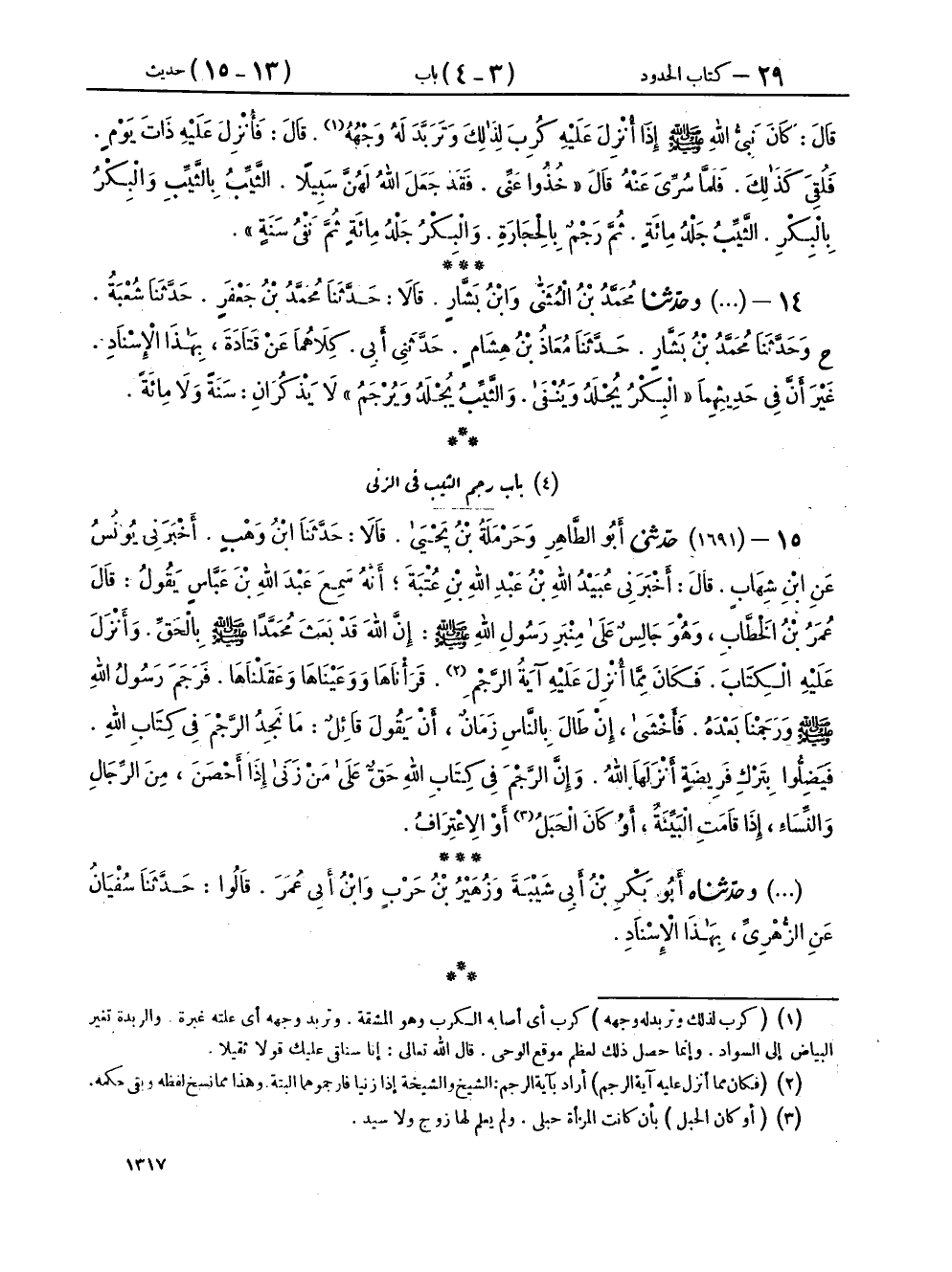 ١٥ - (١٦٩١) حَدَّثَنِي أَبُو الطَّاهِرِ، وَحَرْمَلَةُ بْنُ يَحْيَى، قَالَا: حَدَّثَنَا ابْنُ وَهْبٍ، أَخْبَرَنِي يُونُسُ، عَنِ ابْنِ شِهَابٍ، قَالَ: أَخْبَرَنِي عُبَيْدُ اللهِ بْنُ عَبْدِ اللهِ بْنِ عُتْبَةَ، أَنَّهُ سَمِعَ عَبْدَ اللهِ بْنَ عَبَّاسٍ، يَقُولُ: قَالَ عُمَرُ بْنُ الْخَطَّابِ وَهُوَ جَالِسٌ عَلَى مِنْبَرِ رَسُولِ اللهِ صَلَّى اللهُ عَلَيْهِ وَسَلَّمَ: " إِنَّ اللهَ قَدْ بَعَثَ مُحَمَّدًا صَلَّى اللهُ عَلَيْهِ وَسَلَّمَ بِالْحَقِّ، وَأَنْزَلَ عَلَيْهِ الْكِتَابَ، فَكَانَ مِمَّا أُنْزِلَ عَلَيْهِ آيَةُ الرَّجْمِ، قَرَأْنَاهَا وَوَعَيْنَاهَا وَعَقَلْنَاهَا، فَرَجَمَ رَسُولُ اللهِ صَلَّى اللهُ عَلَيْهِ وَسَلَّمَ، وَرَجَمْنَا بَعْدَهُ، فَأَخْشَى إِنْ طَالَ بِالنَّاسِ زَمَانٌ أَنْ يَقُولَ قَائِلٌ: مَا نَجِدُ الرَّجْمَ فِي كِتَابِ اللهِ فَيَضِلُّوا بِتَرْكِ فَرِيضَةٍ أَنْزَلَهَا اللهُ، وَإِنَّ الرَّجْمَ فِي كِتَابِ اللهِ حَقٌّ عَلَى مَنْ زَنَى إِذَا أَحْصَنَ مِنَ الرِّجَالِ وَالنِّسَاءِ، إِذَا قَامَتِ الْبَيِّنَةُ، أَوْ كَانَ الْحَبَلُ، أَوِ الِاعْتِرَافُ "،