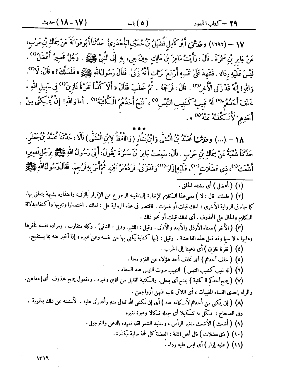 ١٨ - (١٦٩٢) وحَدَّثَنَا مُحَمَّدُ بْنُ الْمُثَنَّى، وَابْنُ بَشَّارٍ، وَاللَّفْظُ لِابْنِ الْمُثَنَّى، قَالَا: حَدَّثَنَا مُحَمَّدُ بْنُ جَعْفَرٍ، حَدَّثَنَا شُعْبَةُ، عَنْ سِمَاكِ بْنِ حَرْبٍ، قَالَ: سَمِعْتُ جَابِرَ بْنَ سَمُرَةَ، يَقُولُ: أُتِيَ رَسُولُ اللهِ صَلَّى اللهُ عَلَيْهِ وَسَلَّمَ بِرَجُلٍ قَصِيرٍ، أَشْعَثَ، ذِي عَضَلَاتٍ، عَلَيْهِ إِزَارٌ، وَقَدْ زَنَى، فَرَدَّهُ مَرَّتَيْنِ، ثُمَّ أَمَرَ بِهِ فَرُجِمَ، فَقَالَ رَسُولُ اللهِ صَلَّى اللهُ عَلَيْهِ وَسَلَّمَ: «كُلَّمَا نَفَرْنَا غَازِينَ فِي سَبِيلِ اللهِ، تَخَلَّفَ أَحَدُكُمْ يَنِبُّ نَبِيبَ التَّيْسِ، يَمْنَحُ إِحْدَاهُنَّ الْكُثْبَةَ، إِنَّ اللهَ لَا يُمْكِنِّي مِنْ أَحَدٍ مِنْهُمْ إِلَّا جَعَلْتُهُ نَكَالًا» أَوْ «نَكَّلْتُهُ»، قَالَ: فَحَدَّثْتُهُ سَعِيدَ بْنَ جُبَيْرٍ، فَقَالَ: «إِنَّهُ رَدَّهُ أَرْبَعَ مَرَّاتٍ»،