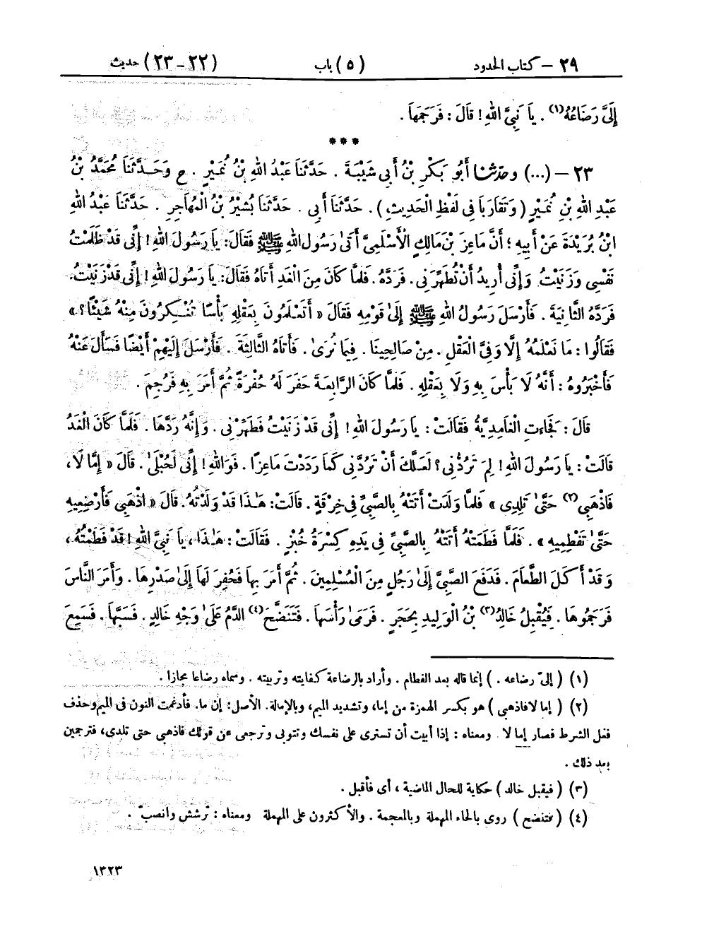 ٢٣ - (١٦٩٥) وحَدَّثَنَا أَبُو بَكْرِ بْنُ أَبِي شَيْبَةَ، حَدَّثَنَا عَبْدُ اللهِ بْنُ نُمَيْرٍ، ح وحَدَّثَنَا مُحَمَّدُ بْنُ عَبْدِ اللهِ بْنِ نُمَيْرٍ، وَتَقَارَبَا فِي لَفْظِ الْحَدِيثِ، حَدَّثَنَا أَبِي، حَدَّثَنَا بَشِيرُ بْنُ الْمُهَاجِرِ، حَدَّثَنَا عَبْدُ اللهِ بْنُ بُرَيْدَةَ، عَنْ أَبِيهِ، أَنَّ مَاعِزَ بْنَ مَالِكٍ الْأَسْلَمِيَّ، أَتَى رَسُولَ اللهِ صَلَّى اللهُ عَلَيْهِ وَسَلَّمَ، فَقَالَ: يَا رَسُولَ اللهِ، إِنِّي قَدْ ظَلَمْتُ نَفْسِي، وَزَنَيْتُ، وَإِنِّي أُرِيدُ أَنْ تُطَهِّرَنِي، فَرَدَّهُ، فَلَمَّا كَانَ مِنَ الْغَدِ أَتَاهُ، فَقَالَ: يَا رَسُولَ اللهِ، إِنِّي قَدْ زَنَيْتُ، فَرَدَّهُ الثَّانِيَةَ، فَأَرْسَلَ رَسُولُ اللهِ صَلَّى اللهُ عَلَيْهِ وَسَلَّمَ إِلَى قَوْمِهِ، فَقَالَ: «أَتَعْلَمُونَ بِعَقْلِهِ بَأْسًا، تُنْكِرُونَ مِنْهُ شَيْئًا؟» فَقَالُوا: مَا نَعْلَمُهُ إِلَّا وَفِيَّ الْعَقْلِ مِنْ صَالِحِينَا فِيمَا نُرَى، فَأَتَاهُ الثَّالِثَةَ، فَأَرْسَلَ إِلَيْهِمْ أَيْضًا فَسَأَلَ عَنْهُ، فَأَخْبَرُوهُ أَنَّهُ لَا بَأْسَ بِهِ، وَلَا بِعَقْلِهِ، فَلَمَّا كَانَ الرَّابِعَةَ حَفَرَ لَهُ حُفْرَةً، ثُمَّ أَمَرَ بِهِ فَرُجِمَ، قَالَ، فَجَاءَتِ الْغَامِدِيَّةُ، فَقَالَتْ: يَا رَسُولَ اللهِ، إِنِّي قَدْ زَنَيْتُ فَطَهِّرْنِي، وَإِنَّهُ رَدَّهَا، فَلَمَّا كَانَ الْغَدُ، قَالَتْ: يَا رَسُولَ اللهِ، لِمَ تَرُدُّنِي؟ لَعَلَّكَ أَنْ تَرُدَّنِي كَمَا رَدَدْتَ مَاعِزًا، فَوَاللهِ إِنِّي لَحُبْلَى، قَالَ: «إِمَّا لَا فَاذْهَبِي حَتَّى تَلِدِي»، فَلَمَّا وَلَدَتْ أَتَتْهُ بِالصَّبِيِّ فِي خِرْقَةٍ، قَالَتْ: هَذَا قَدْ وَلَدْتُهُ، قَالَ: «اذْهَبِي فَأَرْضِعِيهِ حَتَّى تَفْطِمِيهِ»، فَلَمَّا فَطَمَتْهُ أَتَتْهُ بِالصَّبِيِّ فِي يَدِهِ كِسْرَةُ خُبْزٍ، فَقَالَتْ: هَذَا يَا نَبِيَّ اللهِ قَدْ فَطَمْتُهُ، وَقَدْ أَكَلَ الطَّعَامَ، فَدَفَعَ الصَّبِيَّ إِلَى رَجُلٍ مِنَ الْمُسْلِمِينَ، ثُمَّ أَمَرَ بِهَا فَحُفِرَ لَهَا إِلَى صَدْرِهَا، وَأَمَرَ النَّاسَ فَرَجَمُوهَا، فَيُقْبِلُ خَالِدُ بْنُ الْوَلِيدِ بِحَجَرٍ، فَرَمَى رَأْسَهَا فَتَنَضَّحَ الدَّمُ عَلَى وَجْهِ خَالِدٍ فَسَبَّهَا، فَسَمِعَ نَبِيُّ اللهِ صَلَّى اللهُ عَلَيْهِ وَسَلَّمَ سَبَّهُ إِيَّاهَا، فَقَالَ: «مَهْلًا يَا خَالِدُ، فَوَالَّذِي نَفْسِي بِيَدِهِ لَقَدْ تَابَتْ تَوْبَةً لَوْ تَابَهَا صَاحِبُ مَكْسٍ لَغُفِرَ لَهُ»، ثُمَّ أَمَرَ بِهَا فَصَلَّى عَلَيْهَا، وَدُفِنَتْ