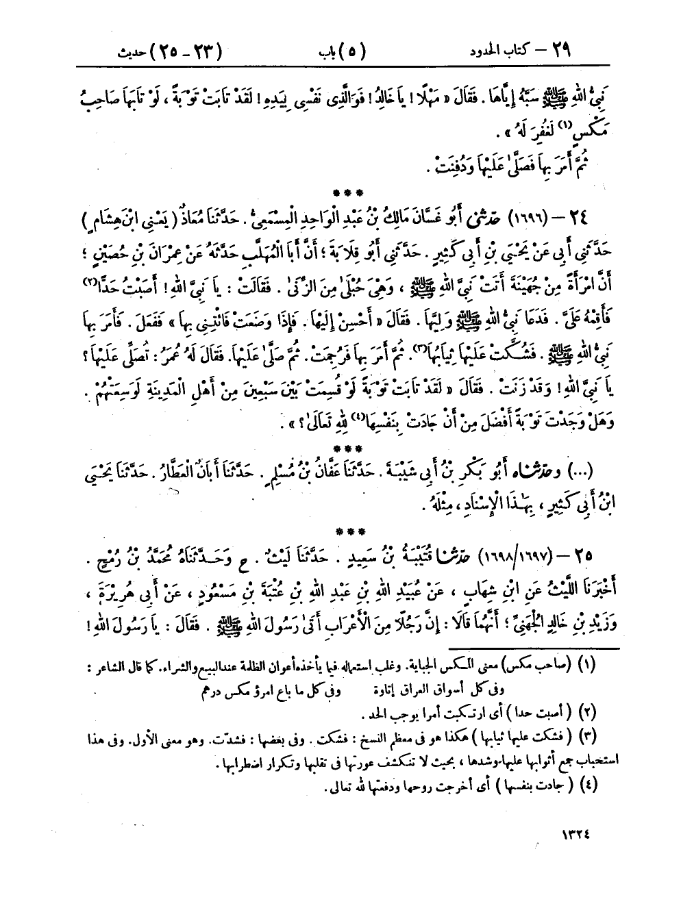٢٤ - (١٦٩٦) حَدَّثَنِي أَبُو غَسَّانَ مَالِكُ بْنُ عَبْدِ الْوَاحِدِ الْمِسْمَعِيُّ، حَدَّثَنَا مُعَاذٌ يَعْنِي ابْنَ هِشَامٍ، حَدَّثَنِي أَبِي، عَنْ يَحْيَى بْنِ أَبِي كَثِيرٍ، حَدَّثَنِي أَبُو قِلَابَةَ، أَنَّ أَبَا الْمُهَلَّبِ، حَدَّثَهُ، عَنْ عِمْرَانَ بْنِ حُصَيْنٍ، أَنَّ امْرَأَةً مِنْ جُهَيْنَةَ أَتَتْ نَبِيَّ اللهِ صَلَّى اللهُ عَلَيْهِ وَسَلَّمَ وَهِيَ حُبْلَى مِنَ الزِّنَى، فَقَالَتْ: يَا نَبِيَّ اللهِ، أَصَبْتُ حَدًّا، فَأَقِمْهُ عَلَيَّ، فَدَعَا نَبِيُّ اللهِ صَلَّى اللهُ عَلَيْهِ وَسَلَّمَ وَلِيَّهَا، فَقَالَ: «أَحْسِنْ إِلَيْهَا، فَإِذَا وَضَعَتْ فَأْتِنِي بِهَا»، فَفَعَلَ، فَأَمَرَ بِهَا نَبِيُّ اللهِ صَلَّى اللهُ عَلَيْهِ وَسَلَّمَ، فَشُكَّتْ عَلَيْهَا ثِيَابُهَا، ثُمَّ أَمَرَ بِهَا فَرُجِمَتْ، ثُمَّ صَلَّى عَلَيْهَا، فَقَالَ لَهُ عُمَرُ: تُصَلِّي عَلَيْهَا يَا نَبِيَّ اللهِ وَقَدْ زَنَتْ؟ فَقَالَ: «لَقَدْ تَابَتْ تَوْبَةً لَوْ قُسِمَتْ بَيْنَ سَبْعِينَ مِنْ أَهْلِ الْمَدِينَةِ لَوَسِعَتْهُمْ، وَهَلْ وَجَدْتَ تَوْبَةً أَفْضَلَ مِنْ أَنْ جَادَتْ بِنَفْسِهَا لِلَّهِ تَعَالَى؟»،