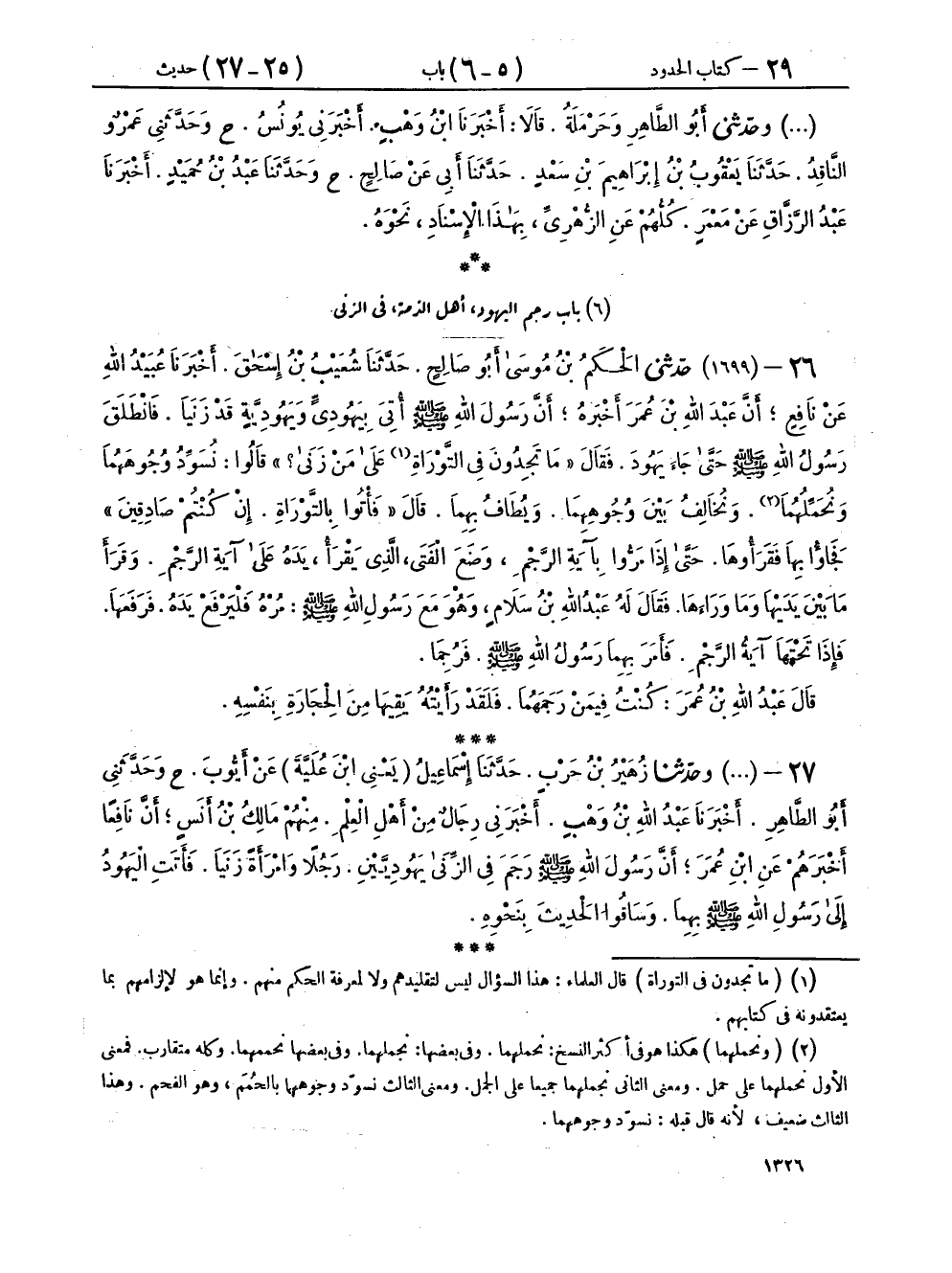 ٢٧ - (١٦٩٩) وحَدَّثَنَا زُهَيْرُ بْنُ حَرْبٍ، حَدَّثَنَا إِسْمَاعِيلُ يَعْنِي ابْنَ عُلَيَّةَ، عَنْ أَيُّوبَ، ح وحَدَّثَنِي أَبُو الطَّاهِرِ، أَخْبَرَنَا عَبْدُ اللهِ بْنُ وَهْبٍ، أَخْبَرَنِي رِجَالٌ مِنْ أَهْلِ الْعِلْمِ مِنْهُمْ مَالِكُ بْنُ أَنَسٍ، أَنَّ نَافِعًا، أَخْبَرَهُمْ عَنِ ابْنِ عُمَرَ، أَنَّ رَسُولَ اللهِ صَلَّى اللهُ عَلَيْهِ وَسَلَّمَ رَجَمَ فِي الزِّنَى يَهُودِيَّيْنِ، رَجُلًا وَامْرَأَةً زَنَيَا، فَأَتَتِ الْيَهُودُ إِلَى رَسُولِ اللهِ صَلَّى اللهُ عَلَيْهِ وَسَلَّمَ بِهِمَا، وَسَاقُوا الْحَدِيثَ بِنَحْوِهِ،