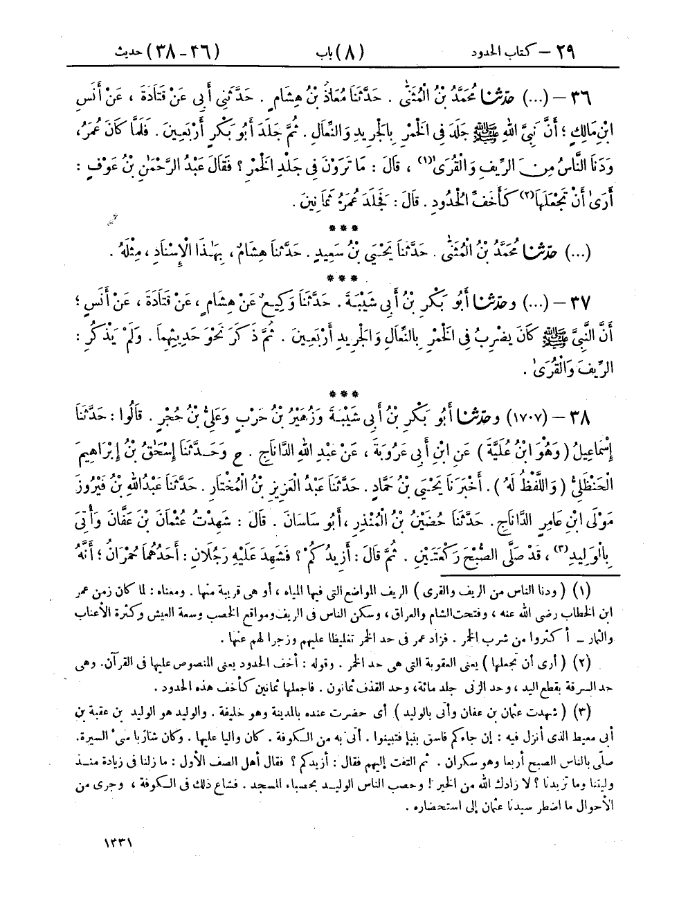 ٣٨ - (١٧٠٧) وحَدَّثَنَا أَبُو بَكْرِ بْنُ أَبِي شَيْبَةَ، وَزُهَيْرُ بْنُ حَرْبٍ، وَعَلِيُّ بْنُ حُجْرٍ، قَالُوا: حَدَّثَنَا إِسْمَاعِيلُ وَهُوَ ابْنُ عُلَيَّةَ، عَنِ ابْنِ أَبِي عَرُوبَةَ، عَنْ عَبْدِ اللهِ الدَّانَاجِ، ح وحَدَّثَنَا إِسْحَاقُ بْنُ إِبْرَاهِيمَ الْحَنْظَلِيُّ، وَاللَّفْظُ لَهُ، أَخْبَرَنَا يَحْيَى بْنُ حَمَّادٍ، حَدَّثَنَا عَبْدُ الْعَزِيزِ بْنُ الْمُخْتَارِ، حَدَّثَنَا عَبْدُ اللهِ بْنُ فَيْرُوزَ، مَوْلَى ابْنِ عَامِرٍ الدَّانَاجِ، حَدَّثَنَا حُضَيْنُ بْنُ الْمُنْذِرِ أَبُو سَاسَانَ، قَالَ: شَهِدْتُ عُثْمَانَ بْنَ عَفَّانَ وَأُتِيَ بِالْوَلِيدِ قَدْ صَلَّى الصُّبْحَ رَكْعَتَيْنِ، ثُمَّ قَالَ: أَزِيدُكُمْ، فَشَهِدَ عَلَيْهِ رَجُلَانِ أَحَدُهُمَا حُمْرَانُ أَنَّهُ شَرِبَ الْخَمْرَ، وَشَهِدَ آخَرُ أَنَّهُ رَآهُ يَتَقَيَّأُ، فَقَالَ عُثْمَانُ: إِنَّهُ لَمْ يَتَقَيَّأْ حَتَّى شَرِبَهَا، فَقَالَ: يَا عَلِيُّ، قُمْ فَاجْلِدْهُ، فَقَالَ عَلِيٌّ: قُمْ يَا حَسَنُ فَاجْلِدْهُ، فَقَالَ الْحَسَنُ: وَلِّ حَارَّهَا مَنْ تَوَلَّى قَارَّهَا، فَكَأَنَّهُ وَجَدَ عَلَيْهِ، فَقَالَ: يَا عَبْدَ اللهِ بْنَ جَعْفَرٍ قُمْ فَاجْلِدْهُ، فَجَلَدَهُ وَعَلِيٌّ يَعُدُّ حَتَّى بَلَغَ أَرْبَعِينَ، فَقَالَ: أَمْسِكْ، ثُمَّ قَالَ: «جَلَدَ النَّبِيُّ صَلَّى اللهُ عَلَيْهِ وَسَلَّمَ أَرْبَعِينَ»، وَجَلَدَ أَبُو بَكْرٍ أَرْبَعِينَ، وَعُمَرُ ثَمَانِينَ، " وَكُلٌّ سُنَّةٌ، وَهَذَا أَحَبُّ إِلَيَّ. زَادَ عَلِيُّ بْنُ حُجْرٍ فِي رِوَايَتِهِ، قَالَ إِسْمَاعِيلُ: وَقَدْ سَمِعْتُ حَدِيثَ الدَّانَاجِ مِنْهُ فَلَمْ أَحْفَظْهُ
