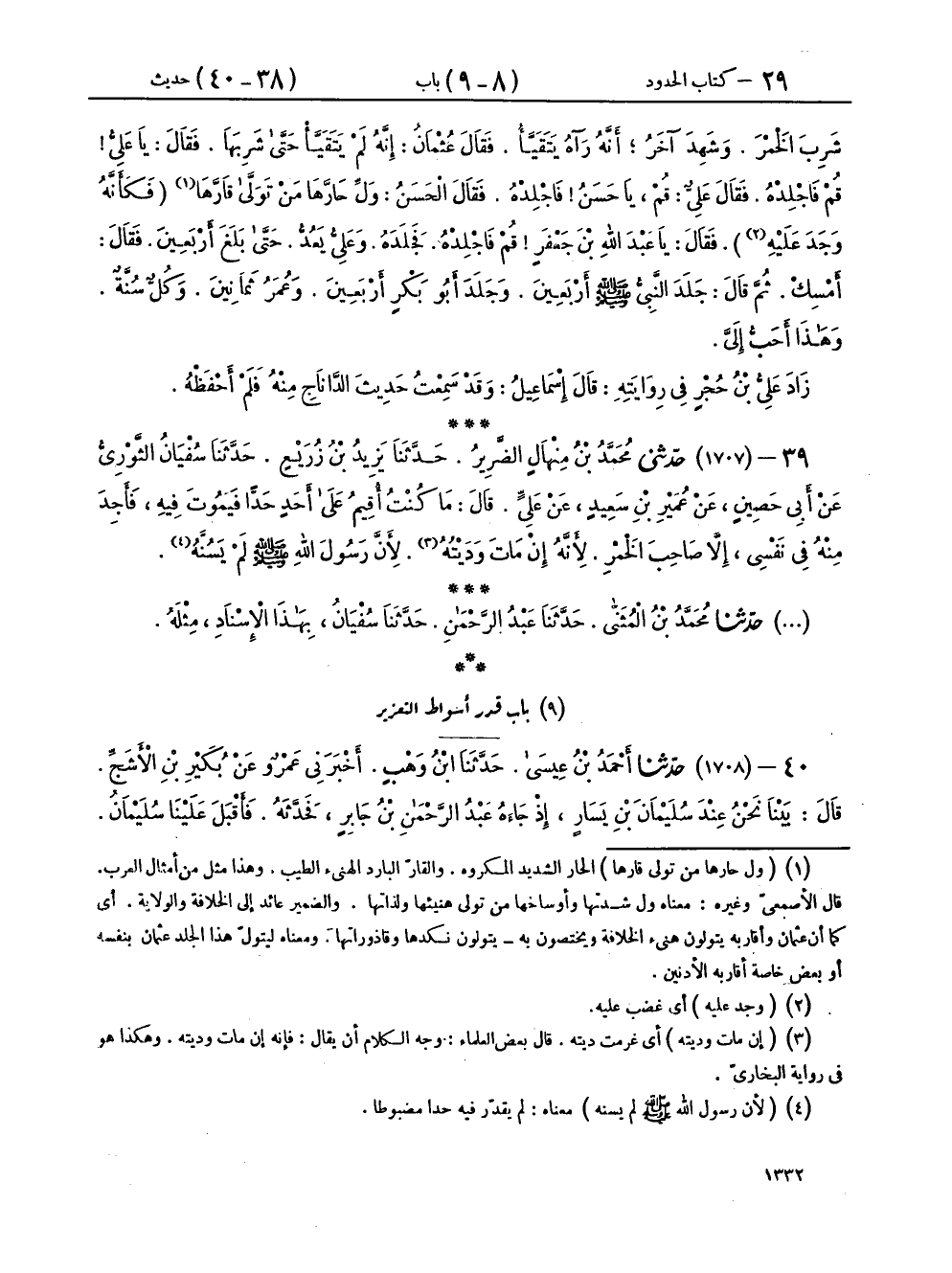 ٣٩ - (١٧٠٧) حَدَّثَنِي مُحَمَّدُ بْنُ مِنْهَالٍ الضَّرِيرُ، حَدَّثَنَا يَزِيدُ بْنُ زُرَيْعٍ، حَدَّثَنَا سُفْيَانُ الثَّوْرِيُّ، عَنْ أَبِي حَصِينٍ، عَنْ عُمَيْرِ بْنِ سَعِيدٍ، عَنْ عَلِيٍّ، قَالَ: «مَا كُنْتُ أُقِيمُ عَلَى أَحَدٍ حَدًّا، فَيَمُوتَ فِيهِ، فَأَجِدَ مِنْهُ فِي نَفْسِي، إِلَّا صَاحِبَ الْخَمْرِ، لِأَنَّهُ إِنْ مَاتَ وَدَيْتُهُ، لِأَنَّ رَسُولَ اللهِ صَلَّى اللهُ عَلَيْهِ وَسَلَّمَ لَمْ يَسُنَّهُ»، حَدَّثَنَا مُحَمَّدُ بْنُ الْمُثَنَّى، حَدَّثَنَا عَبْدُ الرَّحْمَنِ، حَدَّثَنَا سُفْيَانُ، بِهَذَا الْإِسْنَادِ مِثْلَهُ
