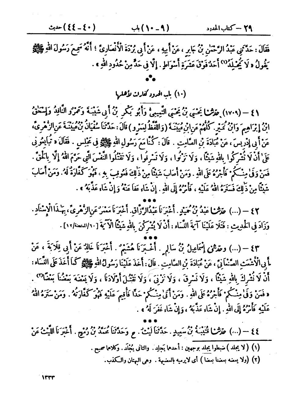 ٤٤ - (١٧٠٩) حَدَّثَنَا قُتَيْبَةُ بْنُ سَعِيدٍ، حَدَّثَنَا لَيْثٌ، ح وحَدَّثَنَا مُحَمَّدُ بْنُ رُمْحٍ، أَخْبَرَنَا اللَّيْثُ، عَنْ يَزِيدَ بْنِ أَبِي حَبِيبٍ، عَنْ أَبِي الْخَيْرِ، عَنْ الصُّنَابِحِيِّ، عَنْ عُبَادَةَ بْنِ الصَّامِتِ، أَنَّهُ قَالَ: إِنِّي لَمِنَ النُّقَبَاءِ الَّذِينَ بَايَعُوا رَسُولَ اللهِ صَلَّى اللهُ عَلَيْهِ وَسَلَّمَ، وَقَالَ: «بَايَعْنَاهُ عَلَى أَنْ لَا نُشْرِكَ بِاللهِ شَيْئًا، وَلَا نَزْنِيَ، وَلَا نَسْرِقَ، وَلَا نَقْتُلَ النَّفْسَ الَّتِي حَرَّمَ اللهُ إِلَّا بِالْحَقِّ، وَلَا نَنْتَهِبَ، وَلَا نَعْصِيَ، فَالْجَنَّةُ إِنْ فَعَلْنَا ذَلِكَ، فَإِنْ غَشِينَا مِنْ ذَلِكَ شَيْئًا كَانَ قَضَاءُ ذَلِكَ إِلَى اللهِ»، وَقَالَ ابْنُ رُمْحٍ: كَانَ قَضَاؤُهُ إِلَى اللهِ