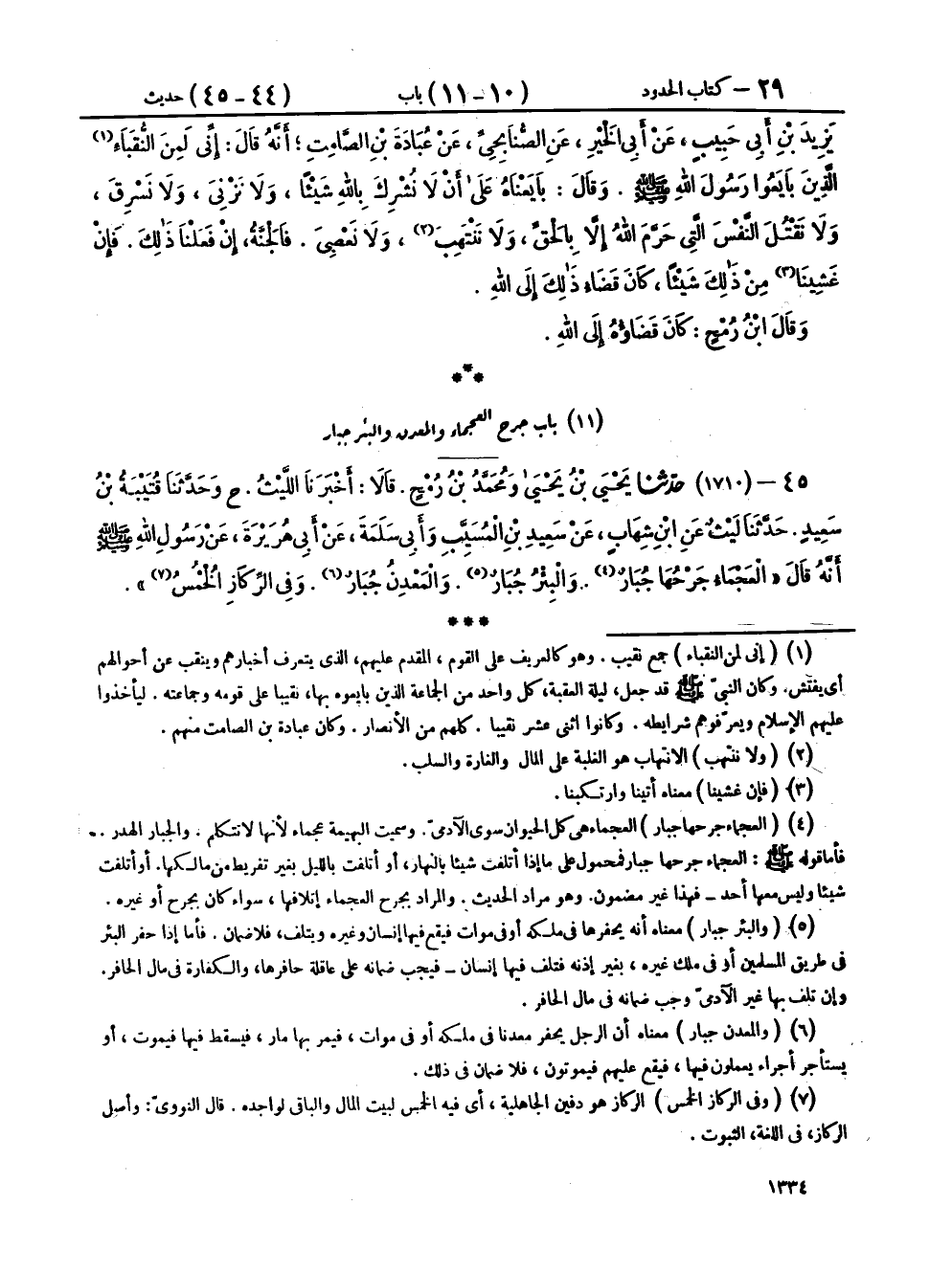 ٤٥ - (١٧١٠) حَدَّثَنَا يَحْيَى بْنُ يَحْيَى، وَمُحَمَّدُ بْنُ رُمْحٍ، قَالَا: أَخْبَرَنَا اللَّيْثُ، ح وحَدَّثَنَا قُتَيْبَةُ بْنُ سَعِيدٍ، حَدَّثَنَا لَيْثٌ، عَنِ ابْنِ شِهَابٍ، عَنْ سَعِيدِ بْنِ الْمُسَيِّبِ، وَأَبِي سَلَمَةَ، عَنْ أَبِي هُرَيْرَةَ، عَنْ رَسُولِ اللهِ صَلَّى اللهُ عَلَيْهِ وَسَلَّمَ، أَنَّهُ قَالَ: «الْعَجْمَاءُ جَرْحُهَا جُبَارٌ، وَالْبِئْرُ جُبَارٌ، وَالْمَعْدِنُ جُبَارٌ، وَفِي الرِّكَازِ الْخُمْسُ»،