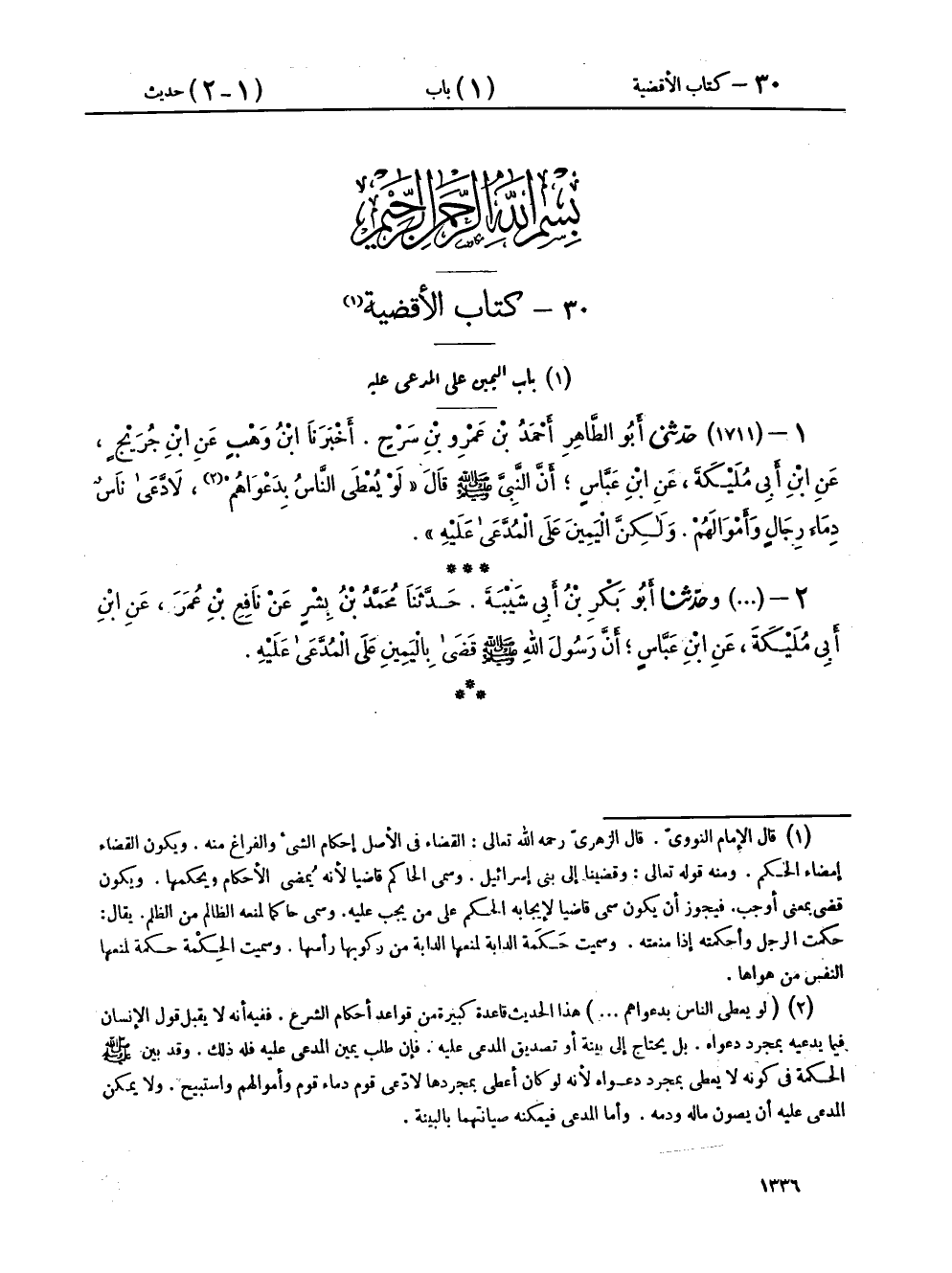 ١ - (١٧١١) حَدَّثَنِي أَبُو الطَّاهِرِ أَحْمَدُ بْنُ عَمْرِو بْنِ سَرْحٍ، أَخْبَرَنَا ابْنُ وَهْبٍ، عَنِ ابْنِ جُرَيْجٍ، عَنِ ابْنِ أَبِي مُلَيْكَةَ، عَنِ ابْنِ عَبَّاسٍ، أَنَّ النَّبِيَّ صَلَّى اللهُ عَلَيْهِ وَسَلَّمَ قَالَ: «لَوْ يُعْطَى النَّاسُ بِدَعْوَاهُمْ، لَادَّعَى نَاسٌ دِمَاءَ رِجَالٍ وَأَمْوَالَهُمْ، وَلَكِنَّ الْيَمِينَ عَلَى الْمُدَّعَى عَلَيْهِ»