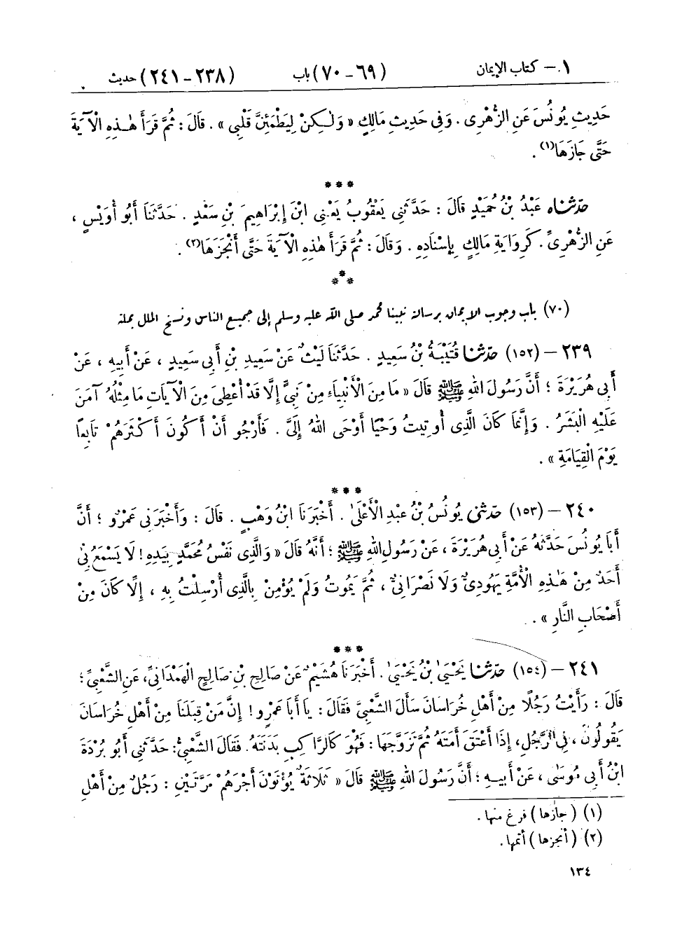 ٢٤١ - (١٥٤) حَدَّثَنَا يَحْيَى بْنُ يَحْيَى، أَخْبَرَنَا هُشَيْمٌ، عَنْ صَالِحِ بْنِ صَالِحٍ الْهَمْدَانِيِّ، عَنِ الشَّعْبِيِّ، قَالَ: رَأَيْتُ رَجُلًا مِنْ أَهْلِ خُرَاسَانَ سَأَلَ الشَّعْبِيَّ، فَقَالَ: يَا أَبَا عَمْرٍو، إِنَّ مَنْ قِبَلَنَا مِنْ أَهْلِ خُرَاسَانَ يَقُولُونَ فِي الرَّجُلِ إِذَا أَعْتَقَ أَمَتَهُ، ثُمَّ تَزَوَّجَهَا: فَهُوَ كَالرَّاكِبِ بَدَنَتَهُ، فَقَالَ الشَّعْبِيُّ: حَدَّثَنِي أَبُو بُرْدَةَ بْنُ أَبِي مُوسَى، عَنْ أَبِيهِ، أَنَّ رَسُولَ اللهِ صَلَّى اللهُ عَلَيْهِ وَسَلَّمَ قَالَ: " ثَلَاثَةٌ يُؤْتَوْنَ أَجْرَهُمْ مَرَّتَيْنِ: رَجُلٌ مِنْ أَهْلِ الْكِتَابِ آمَنَ بِنَبِيِّهِ، وَأَدْرَكَ النَّبِيَّ صَلَّى اللهُ عَلَيْهِ وَسَلَّمَ فَآمَنَ بِهِ وَاتَّبَعَهُ وَصَدَّقَهُ، فَلَهُ أَجْرَانِ، وَعَبْدٌ مَمْلُوكٌ أَدَّى حَقَّ اللهِ تَعَالَى وَحَقَّ سَيِّدِهِ، فَلَهُ أَجْرَانِ، وَرَجُلٌ كَانَتْ لَهُ أَمَةٌ فَغَذَّاهَا، فَأَحْسَنَ غِذَاءَهَا، ثُمَّ أَدَّبَهَا فَأَحْسَنَ أَدَبَهَا، ثُمَّ أَعْتَقَهَا وَتَزَوَّجَهَا فَلَهُ أَجْرَانِ "، ثُمَّ قَالَ الشَّعْبِيُّ لِلْخُرَاسَانِيِّ: خُذْ هَذَا الْحَدِيثَ بِغَيْرِ شَيْءٍ، فَقَدْ كَانَ الرَّجُلُ يَرْحَلُ فِيمَا دُونَ هَذَا إِلَى الْمَدِينَةِ، وَحَدَّثَنَا أَبُو بَكْرِ بْنُ أَبِي شَيْبَةَ، حَدَّثَنَا عَبْدَةُ بْنُ سُلَيْمَانَ، ح، وَحَدَّثَنَا ابْنُ أَبِي عُمَرَ، حَدَّثَنَا سُفْيَانُ، ح، وَحَدَّثَنَا عُبَيْدُ اللهِ بْنُ مُعَاذٍ، حَدَّثَنَا أَبِي، حَدَّثَنَا شُعْبَةُ، كُلُّهُمْ عَنْ صَالِحِ بْنِ صَالِحٍ، بِهَذَا الْإِسْنَادِ نَحْوَهُ
