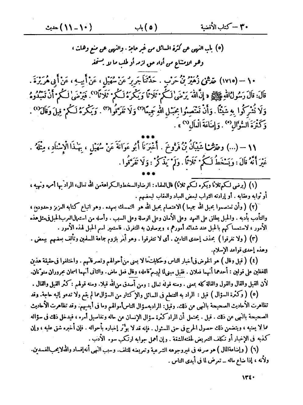 ١٠ - (١٧١٥) حَدَّثَنِي زُهَيْرُ بْنُ حَرْبٍ، حَدَّثَنَا جَرِيرٌ، عَنْ سُهَيْلٍ، عَنْ أَبِيهِ، عَنْ أَبِي هُرَيْرَةَ، قَالَ: قَالَ رَسُولُ اللهِ صَلَّى اللهُ عَلَيْهِ وَسَلَّمَ: " إِنَّ اللهَ يَرْضَى لَكُمْ ثَلَاثًا، وَيَكْرَهُ لَكُمْ ثَلَاثًا، فَيَرْضَى لَكُمْ: أَنْ تَعْبُدُوهُ، وَلَا تُشْرِكُوا بِهِ شَيْئًا، وَأَنْ تَعْتَصِمُوا بِحَبْلِ اللهِ جَمِيعًا وَلَا تَفَرَّقُوا، وَيَكْرَهُ لَكُمْ: قِيلَ وَقَالَ، وَكَثْرَةَ السُّؤَالِ، وَإِضَاعَةِ الْمَالِ "،