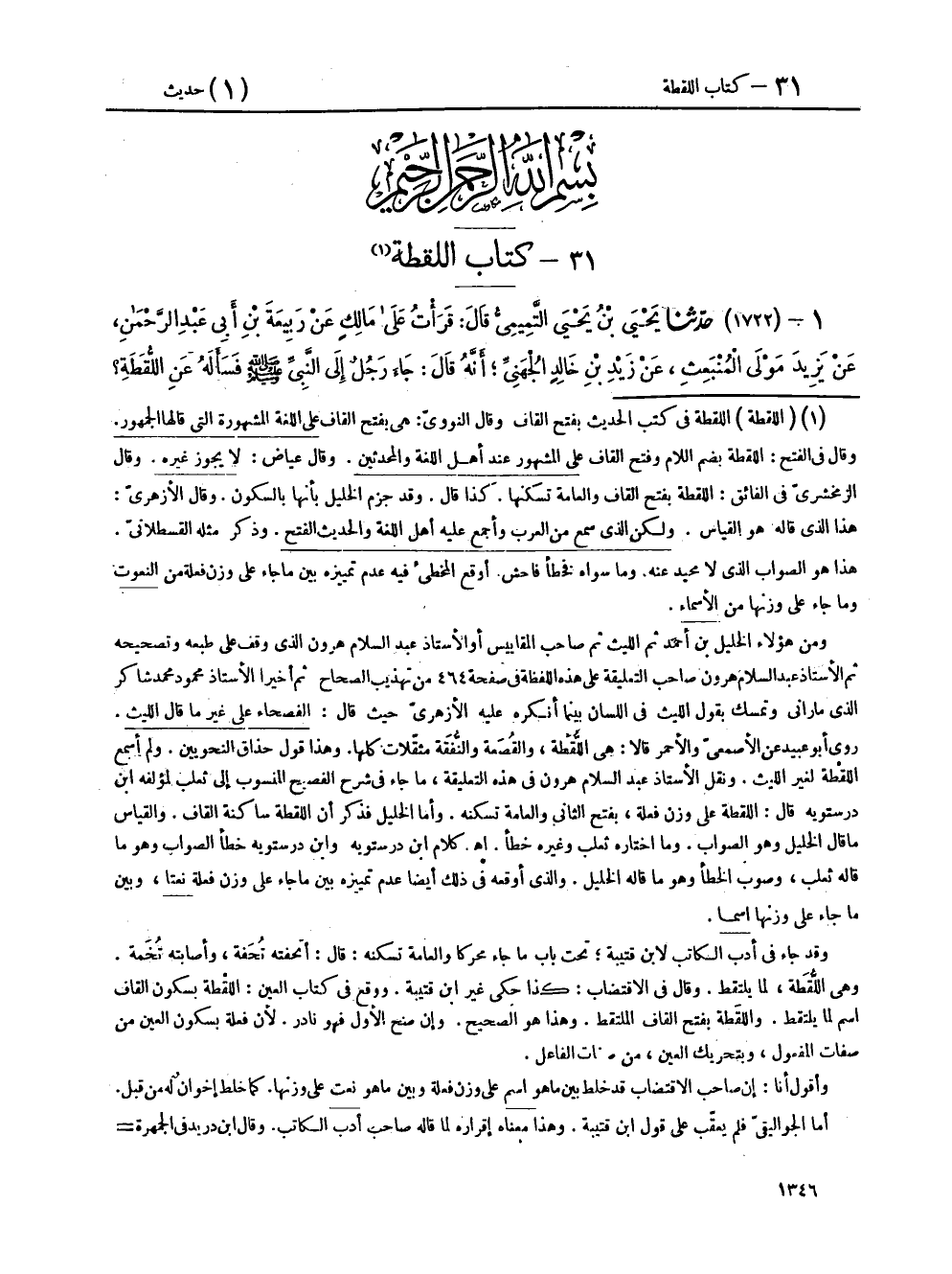 ١ - (١٧٢٢) حَدَّثَنَا يَحْيَى بْنُ يَحْيَى التَّمِيمِيُّ، قَالَ: قَرَأْتُ عَلَى مَالِكٍ، عَنْ رَبِيعَةَ بْنِ أَبِي عَبْدِ الرَّحْمَنِ، عَنْ يَزِيدَ، مَوْلَى الْمُنْبَعِثِ، عَنْ زَيْدِ بْنِ خَالِدٍ الْجُهَنِيِّ، أَنَّهُ قَالَ: جَاءَ رَجُلٌ إِلَى النَّبِيِّ صَلَّى اللهُ عَلَيْهِ وَسَلَّمَ، فَسَأَلَهُ عَنِ اللُّقَطَةِ ⦗١٣٤٧⦘، فَقَالَ: «اعْرِفْ عِفَاصَهَا وَوِكَاءَهَا، ثُمَّ عَرِّفْهَا سَنَةً، فَإِنْ جَاءَ صَاحِبُهَا، وَإِلَّا فَشَأْنَكَ بِهَا»، قَالَ فَضَالَّةُ الْغَنَمِ؟ قَالَ: «لَكَ، أَوْ لِأَخِيكَ، أَوْ لِلذِّئْبِ»، قَالَ: فَضَالَّةُ الْإِبِلِ؟ قَالَ: «مَا لَكَ وَلَهَا، مَعَهَا سِقَاؤُهَا، وَحِذَاؤُهَا تَرِدُ الْمَاءَ، وَتَأْكُلُ الشَّجَرَ حَتَّى يَلْقَاهَا رَبُّهَا»، قَالَ يَحْيَى: أَحْسِبُ قَرَأْتُ عِفَاصَهَا