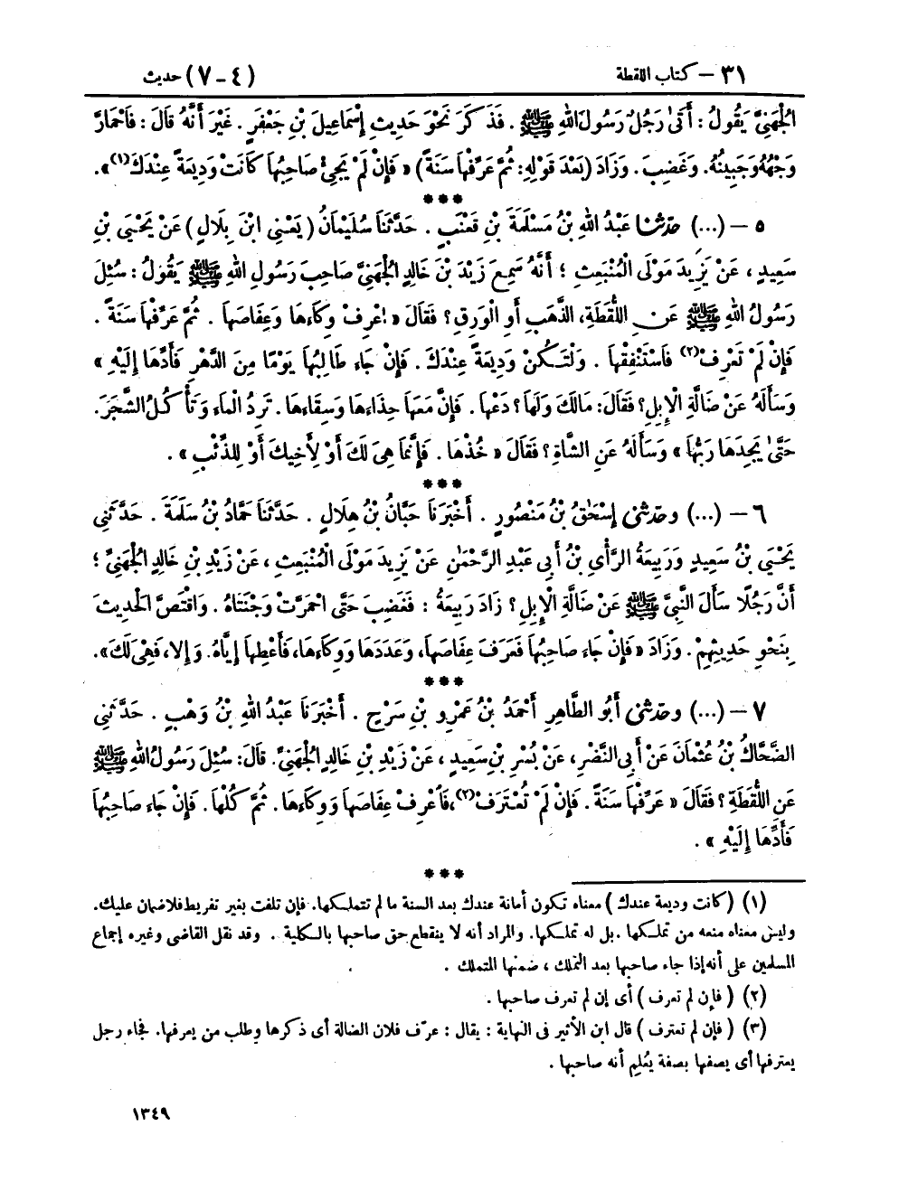 ٥ - (١٧٢٢) حَدَّثَنَا عَبْدُ اللهِ بْنُ مَسْلَمَةَ بْنِ قَعْنَبٍ، حَدَّثَنَا سُلَيْمَانُ يَعْنِي ابْنَ بِلَالٍ، عَنْ يَحْيَى بْنِ سَعِيدٍ، عَنْ يَزِيدَ، مَوْلَى الْمُنْبَعِثِ، أَنَّهُ سَمِعَ زَيْدَ بْنَ خَالِدٍ الْجُهَنِيَّ، صَاحِبَ رَسُولِ اللهِ صَلَّى اللهُ عَلَيْهِ وَسَلَّمَ، يَقُولُ: سُئِلَ رَسُولُ اللهِ صَلَّى اللهُ عَلَيْهِ وَسَلَّمَ عَنِ اللُّقَطَةِ، الذَّهَبِ، أَوِ الْوَرِقِ؟ فَقَالَ: «اعْرِفْ وِكَاءَهَا وَعِفَاصَهَا، ثُمَّ عَرِّفْهَا سَنَةً، فَإِنْ لَمْ تَعْرِفْ فَاسْتَنْفِقْهَا، وَلْتَكُنْ وَدِيعَةً عِنْدَكَ، فَإِنْ جَاءَ طَالِبُهَا يَوْمًا مِنَ الدَّهْرِ فَأَدِّهَا إِلَيْهِ»، وَسَأَلَهُ عَنْ ضَالَّةِ الْإِبِلِ، فَقَالَ: «مَا لَكَ وَلَهَا، دَعْهَا، فَإِنَّ مَعَهَا حِذَاءَهَا وَسِقَاءَهَا، تَرِدُ الْمَاءَ، وَتَأْكُلُ الشَّجَرَ، حَتَّى يَجِدَهَا رَبُّهَا»، وَسَأَلَهُ عَنِ الشَّاةِ، فَقَالَ: «خُذْهَا، فَإِنَّمَا هِيَ لَكَ، أَوْ لِأَخِيكَ، أَوْ لِلذِّئْبِ»،