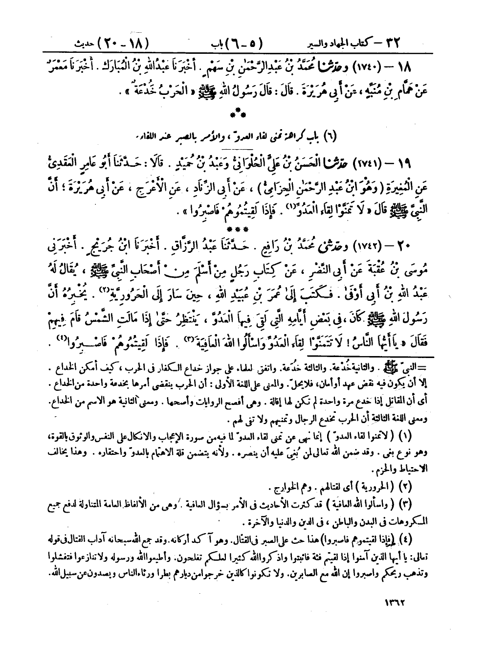 ٢٠ - (١٧٤٢) وحَدَّثَنِي مُحَمَّدُ بْنُ رَافِعٍ، حَدَّثَنَا عَبْدُ الرَّزَّاقِ، أَخْبَرَنَا ابْنُ جُرَيْجٍ، أَخْبَرَنِي مُوسَى بْنُ عُقْبَةَ، عَنْ أَبِي النَّضْرِ، عَنْ كِتَابِ رَجُلٍ مِنْ أَسْلَمَ، مِنْ أَصْحَابِ النَّبِيِّ صَلَّى اللهُ عَلَيْهِ وَسَلَّمَ يُقَالُ لَهُ: عَبْدُ اللهِ بْنُ أَبِي أَوْفَى، فَكَتَبَ إِلَى عُمَرَ بْنِ عُبَيْدِ اللهِ حِينَ سَارَ إِلَى الْحَرُورِيَّةِ، يُخْبِرُهُ، أَنَّ رَسُولَ اللهِ صَلَّى اللهُ عَلَيْهِ وَسَلَّمَ كَانَ فِي بَعْضِ أَيَّامِهِ الَّتِي لَقِيَ فِيهَا الْعَدُوَّ، يَنْتَظِرُ حَتَّى إِذَا مَالَتِ الشَّمْسُ قَامَ فِيهِمْ، فَقَالَ: «يَا أَيُّهَا النَّاسُ، لَا تَتَمَنَّوْا لِقَاءَ الْعَدُوِّ، وَاسْأَلُوا اللهَ الْعَافِيَةَ، فَإِذَا لَقِيتُمُوهُمْ فَاصْبِرُوا، وَاعْلَمُوا أَنَّ الْجَنَّةَ تَحْتَ ظِلَالِ السُّيُوفِ»، ثُمَّ قَامَ النَّبِيُّ صَلَّى اللهُ عَلَيْهِ وَسَلَّمَ، وَقَالَ: «اللهُمَّ، مُنْزِلَ الْكِتَابِ، وَمُجْرِيَ السَّحَابِ، وَهَازِمَ الْأَحْزَابِ، اهْزِمْهُمْ، وَانْصُرْنَا عَلَيْهِمْ»
