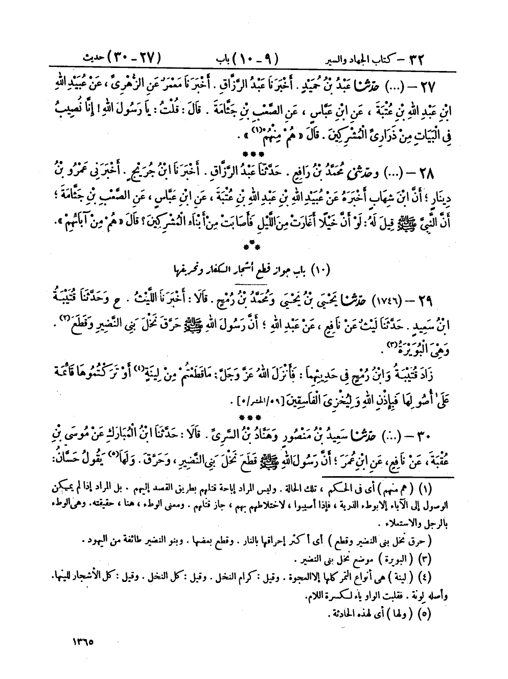 ٣٠ - (١٧٤٦) حَدَّثَنَا سَعِيدُ بْنُ مَنْصُورٍ، وَهَنَّادُ بْنُ السَّرِيِّ، قَالَا: حَدَّثَنَا ابْنُ الْمُبَارَكِ، عَنْ مُوسَى بْنِ عُقْبَةَ، عَنْ نَافِعٍ، عَنِ ابْنِ عُمَرَ، «أَنَّ رَسُولَ اللهِ صَلَّى اللهُ عَلَيْهِ وَسَلَّمَ قَطَعَ نَخْلَ بَنِي النَّضِيرِ، وَحَرَّقَ»، وَلَهَا يَقُولُ حَسَّانُ: