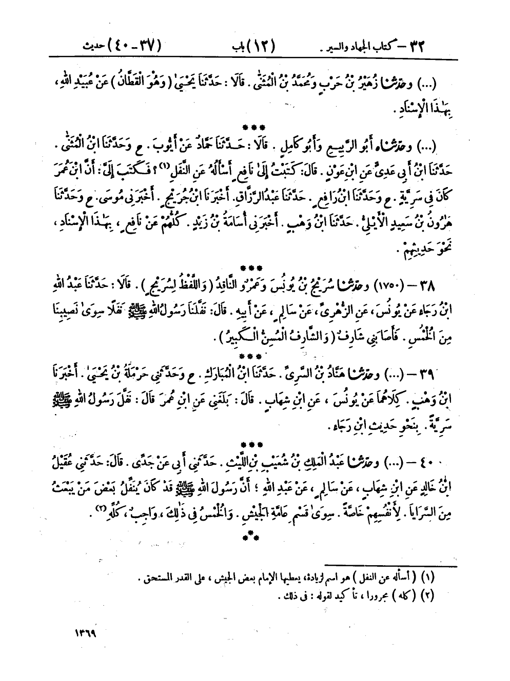 ٢ - وَحَدَّثَنَاهُ أَبُو الرَّبِيعِ، وَأَبُو كَامِلٍ، قَالَا: حَدَّثَنَا حَمَّادٌ، عَنْ أَيُّوبَ، ح وحَدَّثَنَا ابْنُ الْمُثَنَّى، حَدَّثَنَا ابْنُ أَبِي عَدِيٍّ، عَنِ ابْنِ عَوْنٍ، قَالَ: كَتَبْتُ إِلَى نَافِعٍ، أَسْأَلُهُ عَنِ النَّفَلِ، فَكَتَبَ إِلَيَّ أَنَّ ابْنَ عُمَرَ كَانَ فِي سَرِيَّةٍ، ح وحَدَّثَنَا ابْنُ رَافِعٍ، حَدَّثَنَا عَبْدُ الرَّزَّاقِ، أَخْبَرَنَا ابْنُ جُرَيْجٍ، أَخْبَرَنِي مُوسَى، ح وحَدَّثَنَا هَارُونُ بْنُ سَعِيدٍ الْأَيْلِيُّ، حَدَّثَنَا ابْنُ وَهْبٍ، أَخْبَرَنِي أُسَامَةُ بْنُ زَيْدٍ، كُلُّهُمْ عَنْ نَافِعٍ، بِهَذَا الْإِسْنَادِ نَحْوَ حَدِيثِهِمْ