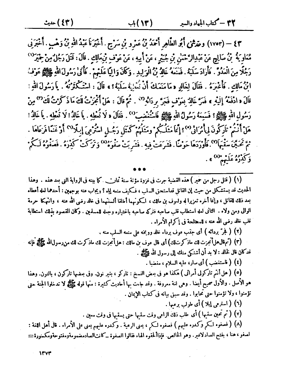 ٤٣ - (١٧٥٣) وحَدَّثَنِي أَبُو الطَّاهِرِ أَحْمَدُ بْنُ عَمْرِو بْنِ سَرْحٍ، أَخْبَرَنَا عَبْدُ اللهِ بْنُ وَهْبٍ، أَخْبَرَنِي مُعَاوِيَةُ بْنُ صَالِحٍ، عَنْ عَبْدِ الرَّحْمَنِ بْنِ جُبَيْرٍ، عَنْ أَبِيهِ، عَنْ عَوْفِ بْنِ مَالِكٍ، قَالَ: قَتَلَ رَجُلٌ مِنْ حِمْيَرَ رَجُلًا مِنَ الْعَدُوِّ، فَأَرَادَ سَلَبَهُ، فَمَنَعَهُ خَالِدُ بْنُ الْوَلِيدِ، وَكَانَ وَالِيًا عَلَيْهِمْ، فَأَتَى رَسُولَ اللهِ صَلَّى اللهُ عَلَيْهِ وَسَلَّمَ عَوْفُ بْنُ مَالِكٍ، فَأَخْبَرَهُ، فَقَالَ لِخَالِدٍ: «مَا مَنَعَكَ أَنْ تُعْطِيَهُ سَلَبَهُ؟» قَالَ: اسْتَكْثَرْتُهُ يَا رَسُولَ اللهِ، قَالَ: «ادْفَعْهُ إِلَيْهِ»، فَمَرَّ خَالِدٌ بِعَوْفٍ، فَجَرَّ بِرِدَائِهِ، ثُمَّ قَالَ: هَلْ أَنْجَزْتُ لَكَ مَا ذَكَرْتُ لَكَ مِنْ رَسُولِ اللهِ صَلَّى اللهُ عَلَيْهِ وَسَلَّمَ، فَسَمِعَهُ رَسُولُ اللهِ صَلَّى اللهُ عَلَيْهِ وَسَلَّمَ فَاسْتُغْضِبَ، فَقَالَ: «لَا تُعْطِهِ يَا خَالِدُ، لَا تُعْطِهِ يَا خَالِدُ، هَلْ أَنْتُمْ تَارِكُونَ لِي أُمَرَائِي؟ إِنَّمَا مَثَلُكُمْ وَمَثَلُهُمْ كَمَثَلِ رَجُلٍ اسْتُرْعِيَ إِبِلًا، أَوْ غَنَمًا، فَرَعَاهَا، ثُمَّ تَحَيَّنَ سَقْيَهَا، فَأَوْرَدَهَا حَوْضًا، فَشَرَعَتْ فِيهِ فَشَرِبَتْ صَفْوَهُ، وَتَرَكَتْ كَدْرَهُ، فَصَفْوُهُ لَكُمْ، وَكَدْرُهُ عَلَيْهِمْ»،