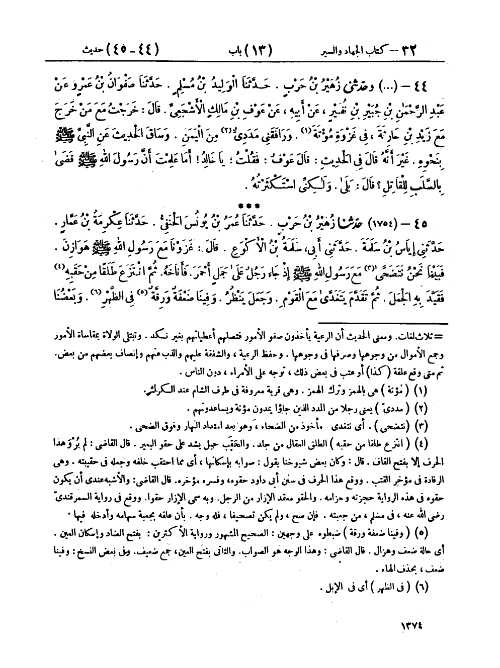 ٤٤ - (١٧٥٣) وحَدَّثَنِي زُهَيْرُ بْنُ حَرْبٍ، حَدَّثَنَا الْوَلِيدُ بْنُ مُسْلِمٍ، حَدَّثَنَا صَفْوَانُ بْنُ عَمْرٍو، عَنْ عَبْدِ الرَّحْمَنِ بْنِ جُبَيْرِ بْنِ نُفَيْرٍ، عَنْ أَبِيهِ، عَنْ عَوْفِ بْنِ مَالِكٍ الْأَشْجَعِيِّ، قَالَ: خَرَجْتُ مَعَ مَنْ خَرَجَ مَعَ زَيْدِ بْنِ حَارِثَةَ فِي غَزْوَةِ مُؤْتَةَ، وَرَافَقَنِي مَدَدِيٌّ مِنَ الْيَمَنِ، وَسَاقَ الْحَدِيثَ عَنِ النَّبِيِّ صَلَّى اللهُ عَلَيْهِ وَسَلَّمَ بِنَحْوِهِ، غَيْرَ أَنَّهُ قَالَ فِي الْحَدِيثِ: قَالَ عَوْفٌ: فَقُلْتُ: يَا خَالِدُ، أَمَا عَلِمْتَ أَنَّ رَسُولَ اللهِ صَلَّى اللهُ عَلَيْهِ وَسَلَّمَ قَضَى بِالسَّلَبِ لِلْقَاتِلِ، قَالَ: بَلَى، وَلَكِنِّي اسْتَكْثَرْتُهُ
