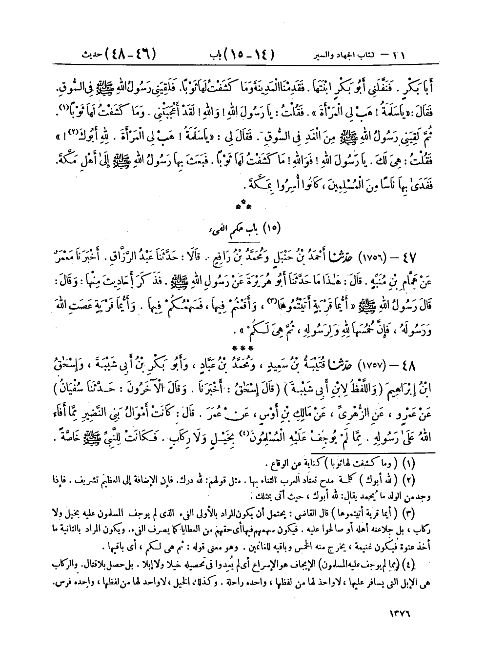٤٨ - (١٧٥٧) حَدَّثَنَا قُتَيْبَةُ بْنُ سَعِيدٍ، وَمُحَمَّدُ بْنُ عَبَّادٍ، وَأَبُو بَكْرِ بْنُ أَبِي شَيْبَةَ، وَإِسْحَاقُ بْنُ إِبْرَاهِيمَ، وَاللَّفْظُ لِابْنِ أَبِي شَيْبَةَ، قَالَ إِسْحَاقُ: أَخْبَرَنَا، وقَالَ الْآخَرُونَ: حَدَّثَنَا سُفْيَانُ، عَنْ عَمْرٍو، عَنِ الزُّهْرِيِّ، عَنْ مَالِكِ بْنِ أَوْسٍ، عَنْ عُمَرَ، قَالَ: «كَانَتْ أَمْوَالُ بَنِي النَّضِيرِ مِمَّا أَفَاءَ اللهُ عَلَى رَسُولِهِ، مِمَّا لَمْ يُوجِفْ عَلَيْهِ الْمُسْلِمُونَ بِخَيْلٍ وَلَا رِكَابٍ، فَكَانَتْ لِلنَّبِيِّ صَلَّى اللهُ عَلَيْهِ وَسَلَّمَ خَاصَّةً، فَكَانَ يُنْفِقُ عَلَى أَهْلِهِ نَفَقَةَ سَنَةٍ، وَمَا بَقِيَ يَجْعَلُهُ فِي الْكُرَاعِ وَالسِّلَاحِ، عُدَّةً فِي سَبِيلِ اللهِ»،