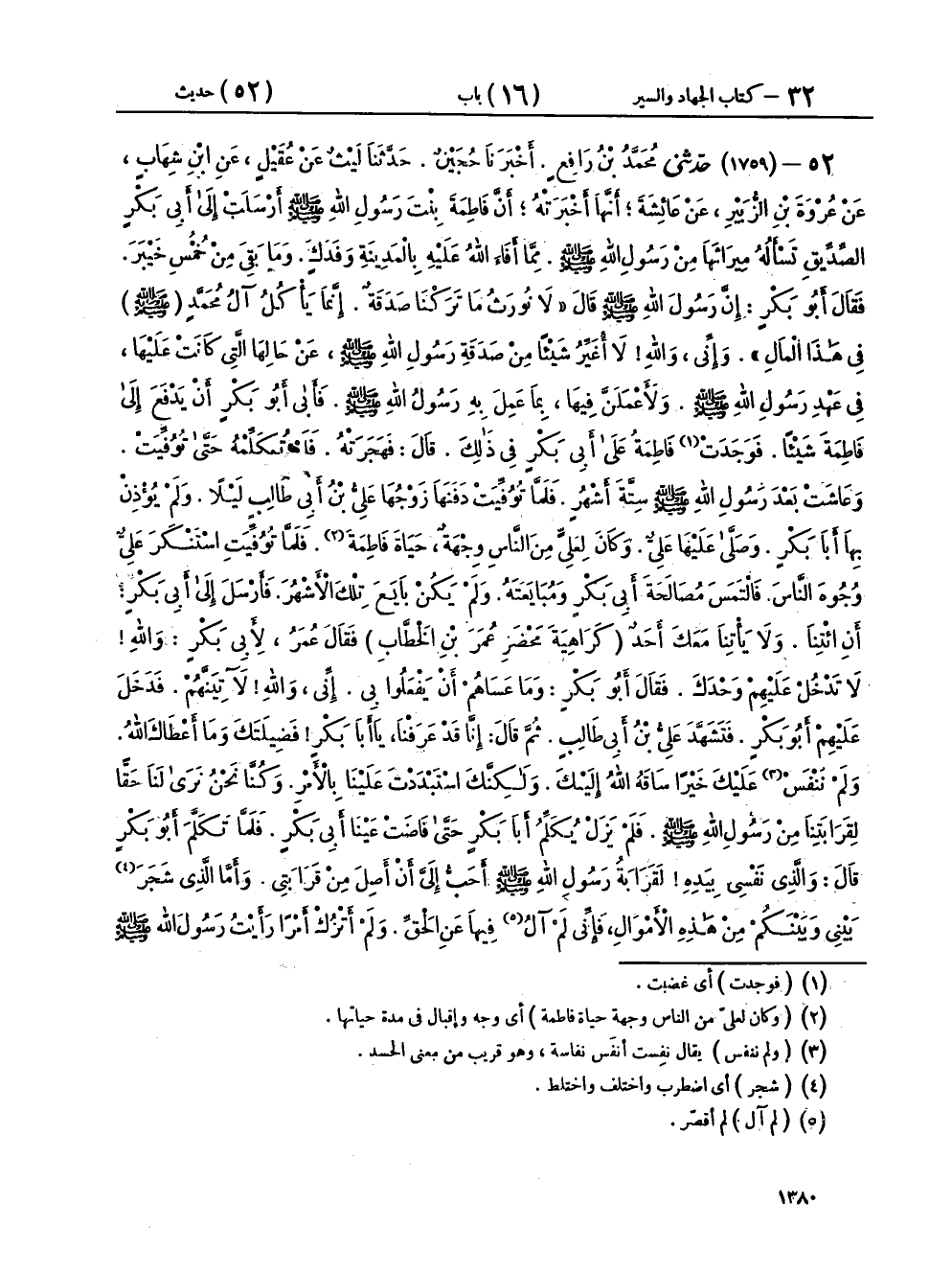 ٥٢ - (١٧٥٩) حَدَّثَنِي مُحَمَّدُ بْنُ رَافِعٍ، أَخْبَرَنَا حُجَيْنٌ، حَدَّثَنَا لَيْثٌ، عَنْ عُقَيْلٍ، عَنِ ابْنِ شِهَابٍ، عَنْ عُرْوَةَ بْنِ الزُّبَيْرِ، عَنْ عَائِشَةَ، أَنَّهَا أَخْبَرَتْهُ، أَنَّ فَاطِمَةَ بِنْتَ رَسُولِ اللهِ صَلَّى اللهُ عَلَيْهِ وَسَلَّمَ أَرْسَلَتْ إِلَى أَبِي بَكْرٍ الصِّدِّيقِ تَسْأَلُهُ مِيرَاثَهَا مِنْ رَسُولِ اللهِ صَلَّى اللهُ عَلَيْهِ وَسَلَّمَ، مِمَّا أَفَاءَ اللهُ عَلَيْهِ بِالْمَدِينَةِ، وَفَدَكٍ، وَمَا بَقِيَ مِنْ خُمْسِ خَيْبَرَ، فَقَالَ أَبُو بَكْرٍ: إِنَّ رَسُولَ اللهِ صَلَّى اللهُ عَلَيْهِ وَسَلَّمَ، قَالَ: «لَا نُورَثُ مَا تَرَكْنَا صَدَقَةٌ، إِنَّمَا يَأْكُلُ آلُ مُحَمَّدٍ صَلَّى اللهُ عَلَيْهِ وَسَلَّمَ فِي هَذَا الْمَالِ»، وَإِنِّي وَاللهِ لَا أُغَيِّرُ شَيْئًا مِنْ صَدَقَةِ رَسُولِ اللهِ صَلَّى اللهُ عَلَيْهِ وَسَلَّمَ عَنْ حَالِهَا الَّتِي كَانَتْ عَلَيْهَا فِي عَهْدِ رَسُولِ اللهِ صَلَّى اللهُ عَلَيْهِ وَسَلَّمَ، وَلَأَعْمَلَنَّ فِيهَا بِمَا عَمِلَ بِهِ رَسُولُ اللهِ صَلَّى اللهُ عَلَيْهِ وَسَلَّمَ، فَأَبَى أَبُو بَكْرٍ أَنْ يَدْفَعَ إِلَى فَاطِمَةَ شَيْئًا، فَوَجَدَتْ فَاطِمَةُ عَلَى أَبِي بَكْرٍ فِي ذَلِكَ، قَالَ: فَهَجَرَتْهُ، فَلَمْ تُكَلِّمْهُ حَتَّى تُوُفِّيَتْ، وَعَاشَتْ بَعْدَ رَسُولِ اللهِ صَلَّى اللهُ عَلَيْهِ وَسَلَّمَ سِتَّةَ أَشْهُرٍ، فَلَمَّا تُوُفِّيَتْ دَفَنَهَا زَوْجُهَا عَلِيُّ بْنُ أَبِي طَالِبٍ لَيْلًا، وَلَمْ يُؤْذِنْ بِهَا أَبَا بَكْرٍ، وَصَلَّى عَلَيْهَا عَلِيٌّ، وَكَانَ لِعَلِيٍّ مِنَ النَّاسِ وِجْهَةٌ حَيَاةَ فَاطِمَةَ، فَلَمَّا تُوُفِّيَتِ اسْتَنْكَرَ عَلِيٌّ وُجُوهَ النَّاسِ، فَالْتَمَسَ مُصَالَحَةَ أَبِي بَكْرٍ وَمُبَايَعَتَهُ، وَلَمْ يَكُنْ بَايَعَ تِلْكَ الْأَشْهُرَ، فَأَرْسَلَ إِلَى أَبِي بَكْرٍ أَنِ ائْتِنَا وَلَا يَأْتِنَا مَعَكَ أَحَدٌ، كَرَاهِيَةَ مَحْضَرِ عُمَرَ بْنِ الْخَطَّابِ، فَقَالَ عُمَرُ لِأَبِي بَكْرٍ: وَاللهِ، لَا تَدْخُلْ عَلَيْهِمْ وَحْدَكَ، فَقَالَ أَبُو بَكْرٍ: وَمَا عَسَاهُمْ أَنْ يَفْعَلُوا بِي؟ إِنِّي وَاللهِ لَآتِيَنَّهُمْ، فَدَخَلَ عَلَيْهِمْ أَبُو بَكْرٍ، فَتَشَهَّدَ عَلِيُّ بْنُ أَبِي طَالِبٍ، ثُمَّ قَالَ: إِنَّا قَدْ عَرَفْنَا يَا أَبَا بَكْرٍ فَضِيلَتَكَ، وَمَا أَعْطَاكَ اللهُ، وَلَمْ نَنْفَسْ عَلَيْكَ خَيْرًا سَاقَهُ اللهُ إِلَيْكَ، وَلَكِنَّكَ اسْتَبْدَدْتَ عَلَيْنَا بِالْأَمْرِ، وَكُنَّا نَحْنُ نَرَى لَنَا حَقًّا لِقَرَابَتِنَا مِنْ رَسُولِ اللهِ صَلَّى اللهُ عَلَيْهِ وَسَلَّمَ، فَلَمْ يَزَلْ يُكَلِّمُ أَبَا بَكْرٍ حَتَّى فَاضَتْ عَيْنَا أَبِي بَكْرٍ، فَلَمَّا تَكَلَّمَ أَبُو بَكْرٍ، قَالَ: وَالَّذِي نَفْسِي بِيَدِهِ، لَقَرَابَةُ رَسُولِ اللهِ صَلَّى اللهُ عَلَيْهِ وَسَلَّمَ أَحَبُّ إِلَيَّ أَنْ أَصِلَ مِنْ قَرَابَتِي، وَأَمَّا الَّذِي شَجَرَ بَيْنِي وَبَيْنَكُمْ مِنْ هَذِهِ الْأَمْوَالِ، فَإِنِّي لَمْ آلُ فِيهَا عَنِ الْحَقِّ، وَلَمْ أَتْرُكْ أَمْرًا رَأَيْتُ رَسُولَ اللهِ صَلَّى اللهُ عَلَيْهِ وَسَلَّمَ يَصْنَعُهُ فِيهَا إِلَّا صَنَعْتُهُ، فَقَالَ عَلِيٌّ لِأَبِي بَكْرٍ: مَوْعِدُكَ الْعَشِيَّةُ لِلْبَيْعَةِ، فَلَمَّا صَلَّى أَبُو بَكْرٍ صَلَاةَ الظُّهْرِ، رَقِيَ عَلَى الْمِنْبَرِ، فَتَشَهَّدَ وَذَكَرَ شَأْنَ عَلِيٍّ وَتَخَلُّفَهُ عَنِ الْبَيْعَةِ، وَعُذْرَهُ بِالَّذِي اعْتَذَرَ إِلَيْهِ، ثُمَّ اسْتَغْفَرَ وَتَشَهَّدَ عَلِيُّ بْنُ أَبِي طَالِبٍ، فَعَظَّمَ حَقَّ أَبِي بَكْرٍ، وَأَنَّهُ لَمْ يَحْمِلْهُ عَلَى الَّذِي صَنَعَ نَفَاسَةً عَلَى أَبِي بَكْرٍ، وَلَا إِنْكَارًا لِلَّذِي فَضَّلَهُ اللهُ بِهِ، وَلَكِنَّا كُنَّا نَرَى لَنَا فِي الْأَ