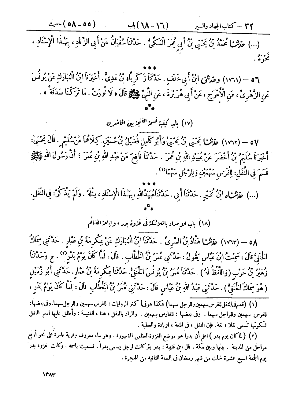 ٥٧ - (١٧٦٢) حَدَّثَنَا يَحْيَى بْنُ يَحْيَى، وَأَبُو كَامِلٍ فُضَيْلُ بْنُ حُسَيْنٍ، كِلَاهُمَا عَنْ سُلَيْمٍ، قَالَ يَحْيَى: أَخْبَرَنَا سُلَيْمُ بْنُ أَخْضَرَ، عَنْ عُبَيْدِ اللهِ بْنِ عُمَرَ، حَدَّثَنَا نَافِعٌ، عَنْ عَبْدِ اللهِ بْنِ عُمَرَ، «أَنَّ رَسُولَ اللهِ صَلَّى اللهُ عَلَيْهِ وَسَلَّمَ قَسَمَ فِي النَّفَلِ، لِلْفَرَسِ سَهْمَيْنِ، وَلِلرَّجُلِ سَهْمًا»،