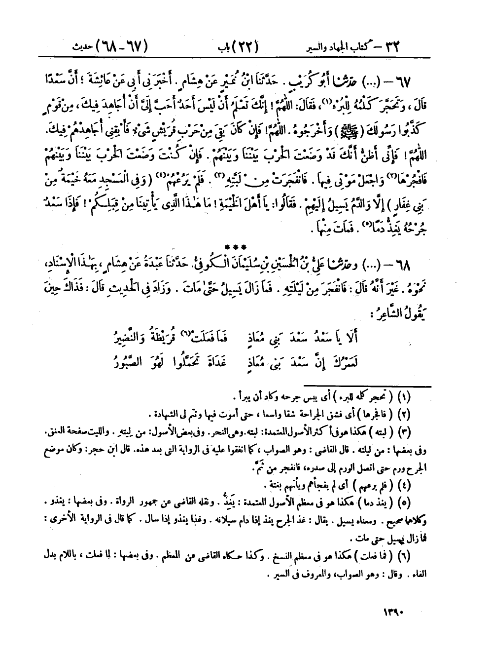 ٦٧ - (١٧٦٩) حَدَّثَنَا أَبُو كُرَيْبٍ، حَدَّثَنَا ابْنُ نُمَيْرٍ، عَنْ هِشَامٍ، أَخْبَرَنِي أَبِي، عَنْ عَائِشَةَ، أَنَّ سَعْدًا، قَالَ وَتَحَجَّرَ كَلْمُهُ لِلْبُرْءِ، فَقَالَ: «اللهُمَّ، إِنَّكَ تَعْلَمُ أَنْ لَيْسَ أَحَدٌ أَحَبَّ إِلَيَّ أَنْ أُجَاهِدَ فِيكَ مِنْ قَوْمٍ كَذَّبُوا رَسُولَكَ صَلَّى اللهُ عَلَيْهِ وَسَلَّمَ، وَأَخْرَجُوهُ، اللهُمَّ، فَإِنْ كَانَ بَقِيَ مِنْ حَرْبِ قُرَيْشٍ شَيْءٌ، فَأَبْقِنِي أُجَاهِدْهُمْ فِيكَ، اللهُمَّ، فَإِنِّي أَظُنُّ أَنَّكَ قَدْ وَضَعْتَ الْحَرْبَ بَيْنَنَا وَبَيْنَهُمْ، فَإِنْ كُنْتَ وَضَعْتَ الْحَرْبَ بَيْنَنَا وَبَيْنَهُمْ فَافْجُرْهَا، وَاجْعَلْ مَوْتِي فِيهَا»، فَانْفَجَرَتْ مِنْ لَبَّتِهِ، فَلَمْ يَرُعْهُمْ وَفِي الْمَسْجِدِ مَعَهُ خَيْمَةٌ مِنْ بَنِي غِفَارٍ إِلَّا وَالدَّمُ يَسِيلُ إِلَيْهِمْ، فَقَالُوا: يَا أَهْلَ الْخَيْمَةِ مَا هَذَا الَّذِي يَأْتِينَا مِنْ قِبَلِكُمْ، فَإِذَا سَعْدٌ جُرْحُهُ يَغِذُّ دَمًا، فَمَاتَ مِنْهَا