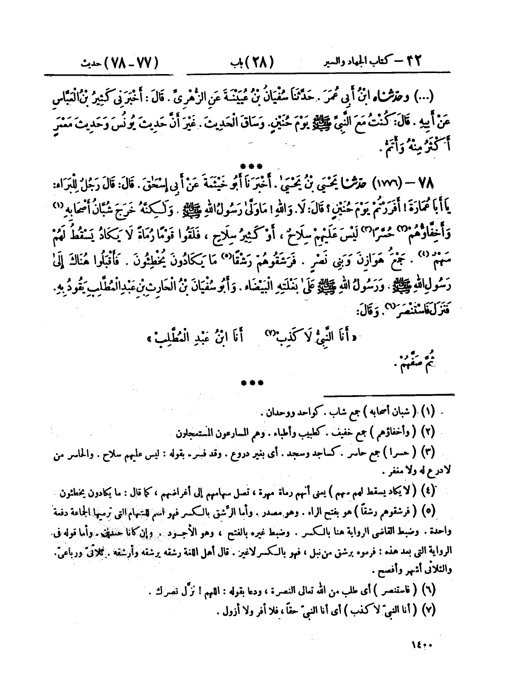 ٧٨ - (١٧٧٦) حَدَّثَنَا يَحْيَى بْنُ يَحْيَى، أَخْبَرَنَا أَبُو خَيْثَمَةَ، عَنْ أَبِي إِسْحَاقَ، قَالَ: قَالَ رَجُلٌ لِلْبَرَاءِ: يَا أَبَا عُمَارَةَ، أَفَرَرْتُمْ يَوْمَ حُنَيْنٍ؟ قَالَ: لَا وَاللهِ، مَا وَلَّى رَسُولُ اللهِ صَلَّى اللهُ عَلَيْهِ وَسَلَّمَ، وَلَكِنَّهُ خَرَجَ شُبَّانُ أَصْحَابِهِ، وَأَخِفَّاؤُهُمْ حُسَّرًا، لَيْسَ عَلَيْهِمْ سِلَاحٌ - أَوْ كَثِيرُ سِلَاحٍ -، فَلَقُوا قَوْمًا رُمَاةً لَا يَكَادُ يَسْقُطُ لَهُمْ سَهْمٌ، جَمْعَ هَوَازِنَ وَبَنِي نَصْرٍ، فَرَشَقُوهُمْ رَشْقًا مَا يَكَادُونَ يُخْطِئُونَ، فَأَقْبَلُوا هُنَاكَ إِلَى رَسُولِ اللهِ صَلَّى اللهُ عَلَيْهِ وَسَلَّمَ، وَرَسُولُ اللهِ صَلَّى اللهُ عَلَيْهِ وَسَلَّمَ عَلَى بَغْلَتِهِ الْبَيْضَاءِ، وَأَبُو سُفْيَانَ بْنُ الْحَارِثِ بْنِ عَبْدِ الْمُطَّلِبِ يَقُودُ بِهِ، فَنَزَلَ فَاسْتَنْصَرَ، وَقَالَ: «أَنَا النَّبِيُّ لَا كَذِبْ، أَنَا ابْنُ عَبْدِ الْمُطَّلِبْ»، ثُمَّ صَفَّهُمْ