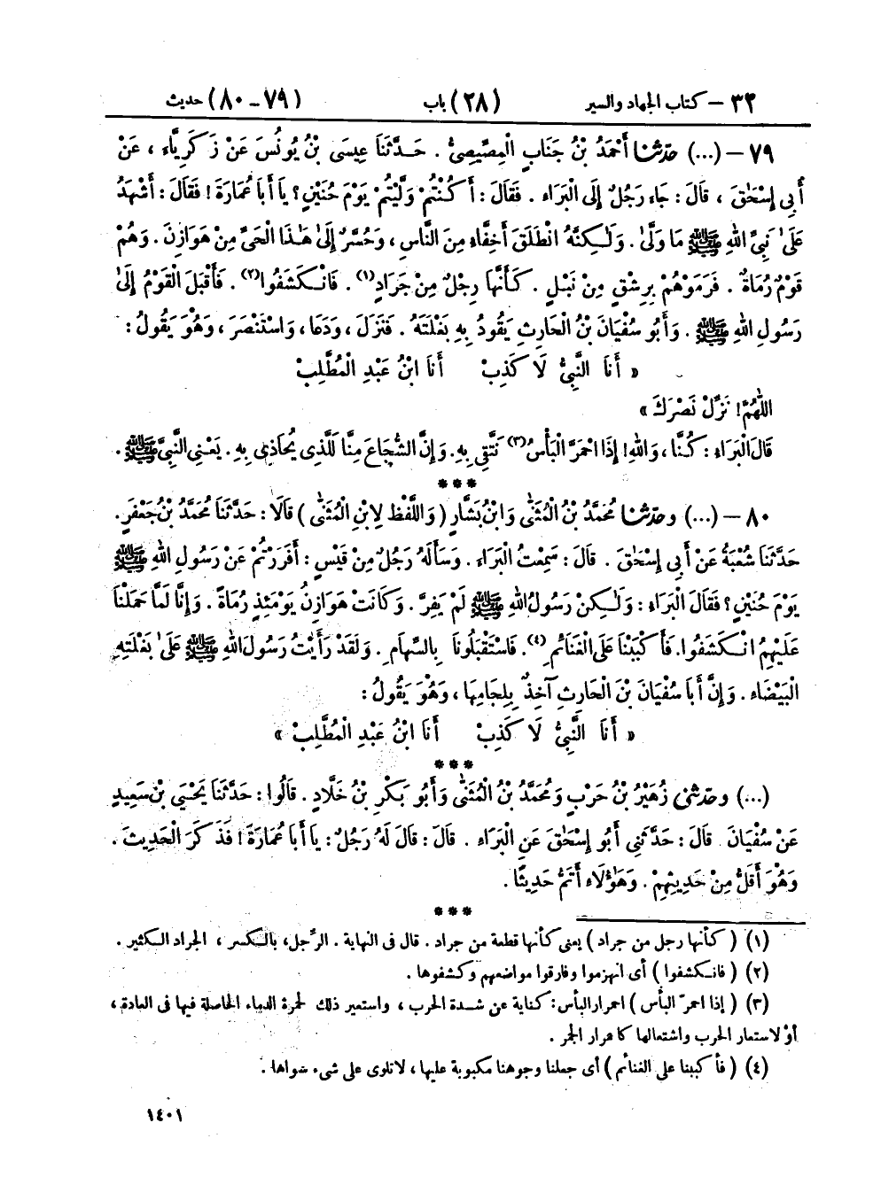 ٧٩ - (١٧٧٦) حَدَّثَنَا أَحْمَدُ بْنُ جَنَابٍ الْمِصِّيصِيُّ، حَدَّثَنَا عِيسَى بْنُ يُونُسَ، عَنْ زَكَرِيَّا، عَنْ أَبِي إِسْحَاقَ، قَالَ: جَاءَ رَجُلٌ إِلَى الْبَرَاءِ، فَقَالَ: أَكُنْتُمْ وَلَّيْتُمْ يَوْمَ حُنَيْنٍ يَا أَبَا عُمَارَةَ؟ فَقَالَ: أَشْهَدُ عَلَى نَبِيِّ اللهِ صَلَّى اللهُ عَلَيْهِ وَسَلَّمَ مَا وَلَّى، وَلَكِنَّهُ انْطَلَقَ أَخِفَّاءُ مِنَ النَّاسِ، وَحُسَّرٌ إِلَى هَذَا الْحَيِّ مِنْ هَوَازِنَ، وَهُمْ قَوْمٌ رُمَاةٌ، فَرَمَوْهُمْ بِرِشْقٍ مِنْ نَبْلٍ كَأَنَّهَا رِجْلٌ مِنْ جَرَادٍ، فَانْكَشَفُوا، فَأَقْبَلَ الْقَوْمُ إِلَى رَسُولِ اللهِ صَلَّى اللهُ عَلَيْهِ وَسَلَّمَ، وَأَبُو سُفْيَانَ بْنُ الْحَارِثِ يَقُودُ بِهِ بَغْلَتَهُ، فَنَزَلَ وَدَعَا وَاسْتَنْصَرَ، وَهُوَ يَقُولُ: «أَنَا النَّبِيُّ لَا كَذِبْ، أَنَا ابْنُ عَبْدِ الْمُطَّلِبْ، اللهُمَّ نَزِّلْ نَصْرَكَ»، قَالَ الْبَرَاءُ: «كُنَّا وَاللهِ إِذَا احْمَرَّ الْبَأْسُ نَتَّقِي بِهِ، وَإِنَّ الشُّجَاعَ مِنَّا لَلَّذِي يُحَاذِي بِهِ، يَعْنِي النَّبِيَّ صَلَّى اللهُ عَلَيْهِ وَسَلَّمَ»