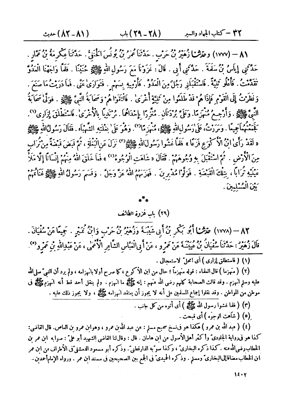 ٨٢ - (١٧٧٨) حَدَّثَنَا أَبُو بَكْرِ بْنُ أَبِي شَيْبَةَ، وَزُهَيْرُ بْنُ حَرْبٍ، وَابْنُ نُمَيْرٍ، جَمِيعًا عَنْ سُفْيَانَ، قَالَ زُهَيْرٌ: حَدَّثَنَا سُفْيَانُ بْنُ عُيَيْنَةَ،، عَنْ عَمْرٍو، عَنْ أَبِي الْعَبَّاسِ الشَّاعِرِ الْأَعْمَى، عَنْ عَبْدِ اللهِ بْنِ عَمْرٍو، قَالَ: حَاصَرَ رَسُولُ اللهِ صَلَّى اللهُ عَلَيْهِ وَسَلَّمَ أَهْلَ الطَّائِفِ، فَلَمْ يَنَلْ مِنْهُمْ شَيْئًا، فَقَالَ: «إِنَّا قَافِلُونَ إِنْ شَاءَ اللهُ»، قَالَ أَصْحَابُهُ: نَرْجِعُ وَلَمْ نَفْتَتِحْهُ فَقَالَ لَهُمْ رَسُولُ اللهِ صَلَّى اللهُ عَلَيْهِ وَسَلَّمَ: «اغْدُوا عَلَى الْقِتَالِ»، فَغَدَوْا عَلَيْهِ، فَأَصَابَهُمْ جِرَاحٌ، فَقَالَ لَهُمْ رَسُولُ اللهِ صَلَّى اللهُ عَلَيْهِ وَسَلَّمَ: «إِنَّا قَافِلُونَ غَدًا»، قَالَ: فَأَعْجَبَهُمْ ذَلِكَ، فَضَحِكَ رَسُولُ اللهِ صَلَّى اللهُ عَلَيْهِ وَسَلَّمَ