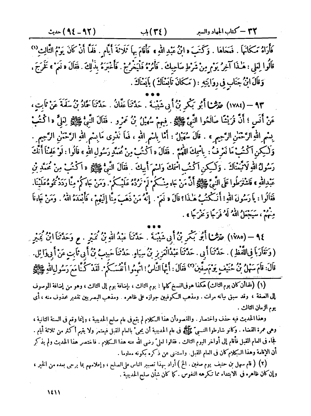 ٩٤ - (١٧٨٥) حَدَّثَنَا أَبُو بَكْرِ بْنُ أَبِي شَيْبَةَ، حَدَّثَنَا عَبْدُ اللهِ بْنُ نُمَيْرٍ، ح وحَدَّثَنَا ابْنُ نُمَيْرٍ، وَتَقَارَبَا فِي اللَّفْظِ، حَدَّثَنَا أَبِي، حَدَّثَنَا عَبْدُ الْعَزِيزِ بْنُ سِيَاهٍ، حَدَّثَنَا حَبِيبُ بْنُ أَبِي ثَابِتٍ، عَنْ أَبِي وَائِلٍ، قَالَ: قَامَ سَهْلُ بْنُ حُنَيْفٍ يَوْمَ صِفِّينَ، فَقَالَ: أَيُّهَا النَّاسُ، اتَّهِمُوا أَنْفُسَكُمْ، لَقَدْ كُنَّا مَعَ رَسُولِ اللهِ صَلَّى اللهُ عَلَيْهِ وَسَلَّمَ يَوْمَ الْحُدَيْبِيَةِ وَلَوْ نَرَى قِتَالًا لَقَاتَلْنَا، وَذَلِكَ فِي الصُّلْحِ الَّذِي كَانَ بَيْنَ رَسُولِ اللهِ صَلَّى اللهُ عَلَيْهِ وَسَلَّمَ وَبَيْنَ الْمُشْرِكِينَ، فَجَاءَ عُمَرُ بْنُ الْخَطَّابِ، فَأَتَى رَسُولَ اللهِ صَلَّى اللهُ عَلَيْهِ وَسَلَّمَ، فَقَالَ: يَا رَسُولَ اللهِ، أَلَسْنَا عَلَى حَقٍّ وَهُمْ عَلَى بَاطِلٍ؟ قَالَ: «بَلَى»، قَالَ: أَلَيْسَ قَتْلَانَا فِي الْجَنَّةِ وَقَتْلَاهُمْ فِي النَّارِ؟ قَالَ: «بَلَى»، قَالَ: فَفِيمَ نُعْطِي الدَّنِيَّةَ فِي دِينِنَا، وَنَرْجِعُ، وَلَمَّا يَحْكُمِ اللهُ بَيْنَنَا وَبَيْنَهُمْ، فَقَالَ: «يَا ابْنَ الْخَطَّابِ، إِنِّي رَسُولُ اللهِ وَلَنْ يُضَيِّعَنِي اللهُ أَبَدًا»، قَالَ: فَانْطَلَقَ عُمَرُ فَلَمْ يَصْبِرْ مُتَغَيِّظًا، فَأَتَى أَبَا بَكْرٍ، فَقَالَ: يَا أَبَا بَكْرٍ أَلَسْنَا عَلَى حَقٍّ وَهُمْ عَلَى بَاطِلٍ؟ قَالَ: بَلَى، قَالَ: أَلَيْسَ قَتْلَانَا فِي الْجَنَّةِ وَقَتْلَاهُمْ فِي النَّارِ؟ قَالَ: بَلَى، قَالَ: فَعَلَامَ نُعْطِي الدَّنِيَّةَ فِي دِينِنَا، وَنَرْجِعُ وَلَمَّا يَحْكُمِ اللهُ بَيْنَنَا وَبَيْنَهُمْ؟ فَقَالَ: يَا ابْنَ الْخَطَّابِ، إِنَّهُ رَسُولُ اللهِ وَلَنْ يُضَيِّعَهُ اللهُ أَبَدًا، قَالَ: فَنَزَلَ الْقُرْآنُ عَلَى رَسُولِ اللهِ صَلَّى اللهُ عَلَيْهِ وَسَلَّمَ بِالْفَتْحِ، فَأَرْسَلَ إِلَى عُمَرَ، فَأَقْرَأَهُ إِيَّاهُ، فَقَالَ: يَا رَسُولَ اللهِ، أَوْ فَتْحٌ هُو؟ قَالَ: «نَعَمْ»، فَطَابَتْ نَفْسُهُ وَرَجَعَ