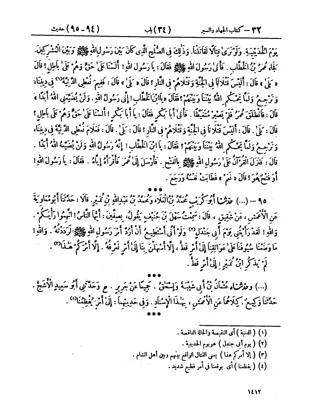 ٩٥ - (١٧٨٥) حَدَّثَنَا أَبُو كُرَيْبٍ مُحَمَّدُ بْنُ الْعَلَاءِ، وَمُحَمَّدُ بْنُ عَبْدِ اللهِ بْنِ نُمَيْرٍ، قَالَا: حَدَّثَنَا أَبُو مُعَاوِيَةَ، عَنِ الْأَعْمَشِ، عَنْ شَقِيقٍ، قَالَ: سَمِعْتُ سَهْلَ بْنَ حُنَيْفٍ، يَقُولُ بِصِفِّينَ: «أَيُّهَا النَّاسُ، اتَّهِمُوا رَأْيَكُمْ، وَاللهِ، لَقَدْ رَأَيْتُنِي يَوْمَ أَبِي جَنْدَلٍ، وَلَوْ أَنِّي أَسْتَطِيعُ أَنْ أَرُدَّ أَمْرَ رَسُولِ اللهِ صَلَّى اللهُ عَلَيْهِ وَسَلَّمَ لَرَدَدْتُهُ، وَاللهِ، مَا وَضَعْنَا سُيُوفَنَا عَلَى عَوَاتِقِنَا إِلَى أَمْرٍ قَطُّ، إِلَّا أَسْهَلْنَ بِنَا إِلَى أَمْرٍ نَعْرِفُهُ إِلَّا أَمْرَكُمْ هَذَا»، لَمْ يَذْكُرِ ابْنُ نُمَيْرٍ إِلَى أَمْرٍ قَطُّ،