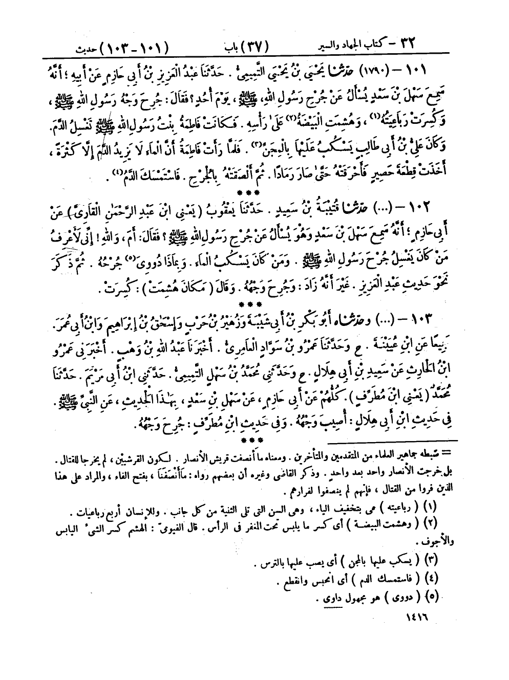 ١٠٣ - (١٧٩٠) وَحَدَّثَنَاهُ أَبُو بَكْرِ بْنُ أَبِي شَيْبَةَ، وَزُهَيْرُ بْنُ حَرْبٍ، وَإِسْحَاقُ بْنُ إِبْرَاهِيمَ، وَابْنُ أَبِي عُمَرَ، جَمِيعًا عَنِ ابْنِ عُيَيْنَةَ، ح وحَدَّثَنَا عَمْرُو بْنُ سَوَّادٍ الْعَامِرِيُّ، أَخْبَرَنَا عَبْدُ اللهِ بْنُ وَهْبٍ، أَخْبَرَنِي عَمْرُو بْنُ الْحَارِثِ، عَنْ سَعِيدِ بْنِ أَبِي هِلَالٍ، ح وحَدَّثَنِي مُحَمَّدُ بْنُ سَهْلٍ التَّمِيمِيُّ، حَدَّثَنِي ابْنُ أَبِي مَرْيَمَ، حَدَّثَنَا مُحَمَّدٌ يَعْنِي ابْنَ مُطَرِّفٍ، كُلُّهُمْ عَنْ أَبِي حَازِمٍ، عَنْ سَهْلِ بْنِ سَعْدٍ، بِهَذَا الْحَدِيثِ عَنِ النَّبِيِّ صَلَّى اللهُ عَلَيْهِ وَسَلَّمَ، فِي حَدِيثِ ابْنِ أَبِي هِلَالٍ أُصِيبَ وَجْهُهُ، وَفِي حَدِيثِ ابْنِ مُطَرِّفٍ جُرِحَ وَجْهُهُ
