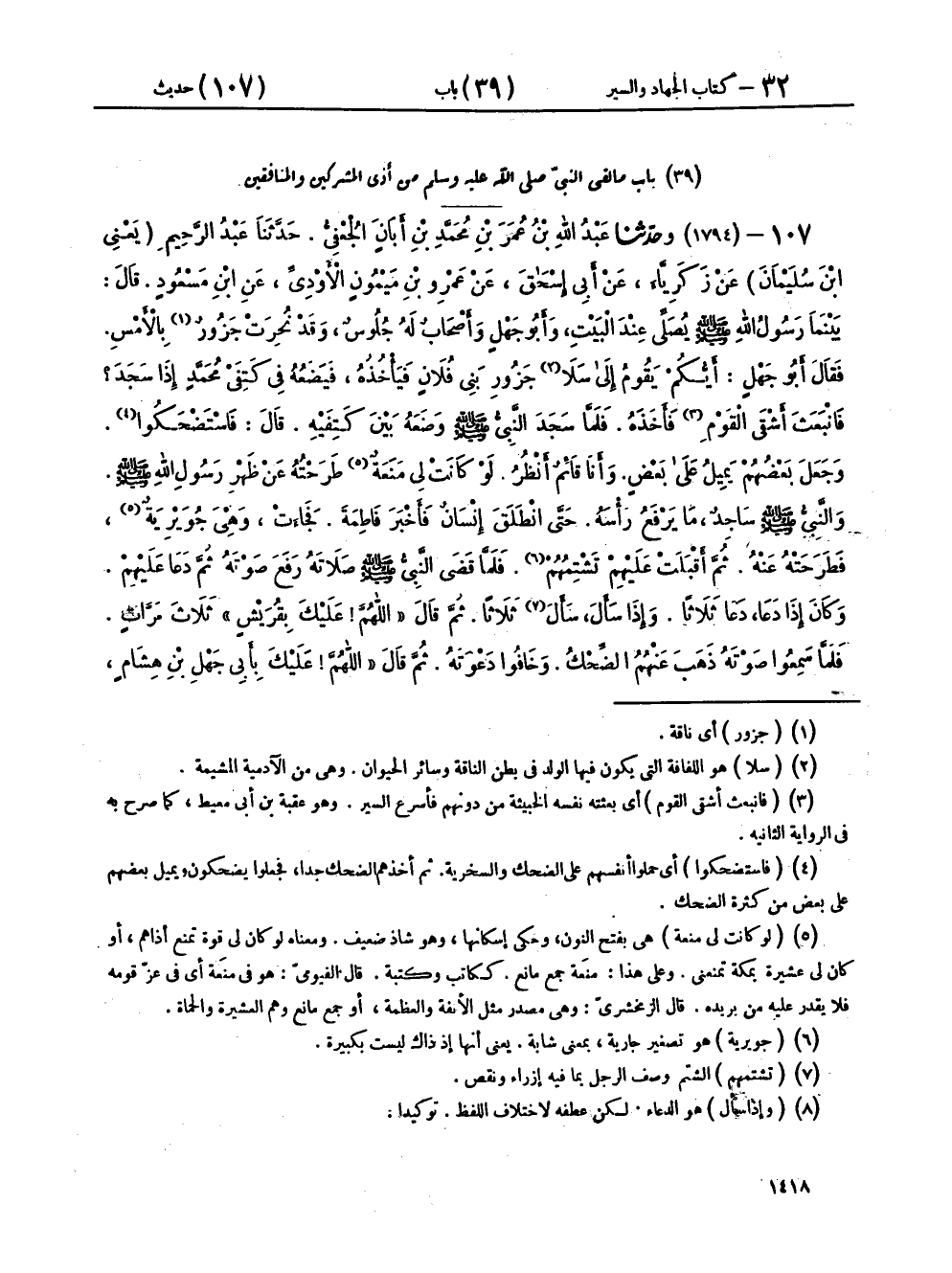 ١٠٧ - (١٧٩٤) وحَدَّثَنَا عَبْدُ اللهِ بْنُ عُمَرَ بْنِ مُحَمَّدِ بْنِ أَبَانَ الْجُعْفِيُّ، حَدَّثَنَا عَبْدُ الرَّحِيمِ يَعْنِي ابْنَ سُلَيْمَانَ، عَنْ زَكَرِيَّا، عَنْ أَبِي إِسْحَاقَ، عَنْ عَمْرِو بْنِ مَيْمُونٍ الْأَوْدِيِّ، عَنِ ابْنِ مَسْعُودٍ، قَالَ: بَيْنَمَا رَسُولُ اللهِ صَلَّى اللهُ عَلَيْهِ وَسَلَّمَ يُصَلِّي عِنْدَ الْبَيْتِ، وَأَبُو جَهْلٍ وَأَصْحَابٌ لَهُ جُلُوسٌ، وَقَدْ نُحِرَتْ جَزُورٌ بِالْأَمْسِ، فَقَالَ أَبُو جَهْلٍ: أَيُّكُمْ يَقُومُ إِلَى سَلَا جَزُورِ بَنِي فُلَانٍ، فَيَأْخُذُهُ فَيَضَعُهُ فِي كَتِفَيْ مُحَمَّدٍ إِذَا سَجَدَ؟ فَانْبَعَثَ أَشْقَى الْقَوْمِ فَأَخَذَهُ، فَلَمَّا سَجَدَ النَّبِيُّ صَلَّى اللهُ عَلَيْهِ وَسَلَّمَ وَضَعَهُ بَيْنَ كَتِفَيْهِ، قَالَ: فَاسْتَضْحَكُوا، وَجَعَلَ بَعْضُهُمْ يَمِيلُ عَلَى بَعْضٍ وَأَنَا قَائِمٌ أَنْظُرُ، لَوْ كَانَتْ لِي مَنَعَةٌ طَرَحْتُهُ عَنْ ظَهْرِ رَسُولِ اللهِ صَلَّى اللهُ عَلَيْهِ وَسَلَّمَ، وَالنَّبِيُّ صَلَّى اللهُ عَلَيْهِ وَسَلَّمَ سَاجِدٌ مَا يَرْفَعُ رَأْسَهُ حَتَّى انْطَلَقَ إِنْسَانٌ فَأَخْبَرَ فَاطِمَةَ، فَجَاءَتْ وَهِيَ جُوَيْرِيَةٌ، فَطَرَحَتْهُ عَنْهُ، ثُمَّ أَقْبَلَتْ عَلَيْهِمْ تَشْتِمُهُمْ، فَلَمَّا قَضَى النَّبِيُّ صَلَّى اللهُ عَلَيْهِ وَسَلَّمَ صَلَاتَهُ، رَفَعَ صَوْتَهُ، ثُمَّ دَعَا عَلَيْهِمْ، وَكَانَ إِذَا دَعَا دَعَا ثَلَاثًا، وَإِذَا سَأَلَ سَأَلَ ثَلَاثًا، ثُمَّ قَالَ: «اللهُمَّ، عَلَيْكَ بِقُرَيْشٍ» ثَلَاثَ مَرَّاتٍ، فَلَمَّا سَمِعُوا صَوْتَهُ ذَهَبَ عَنْهُمُ الضِّحْكُ، وَخَافُوا دَعْوَتَهُ، ثُمَّ قَالَ: «اللهُمَّ، عَلَيْكَ بِأَبِي جَهْلِ بْنِ هِشَامٍ، وَعُتْبَةَ بْنِ رَبِيعَةَ، وَشَيْبَةَ بْنِ رَبِيعَةَ، وَالْوَلِيدِ بْنِ عُقْبَةَ، وَأُمَيَّةَ بْنِ خَلَفٍ، وَعُقْبَةَ بْنِ أَبِي مُعَيْطٍ» - وَذَكَرَ السَّابِعَ وَلَمْ أَحْفَظْهُ - فَوَالَّذِي بَعَثَ مُحَمَّدًا صَلَّى اللهُ عَلَيْهِ وَسَلَّمَ بِالْحَقِّ، لَقَدْ رَأَيْتُ الَّذِينَ سَمَّى صَرْعَى يَوْمَ بَدْرٍ، ثُمَّ سُحِبُوا إِلَى الْقَلِيبِ - قَلِيبِ بَدْرٍ - قَالَ أَبُو إِسْحَاقَ: «الْوَلِيدُ بْنُ عُقْبَةَ غَلَطٌ فِي هَذَا الْحَدِيثِ»