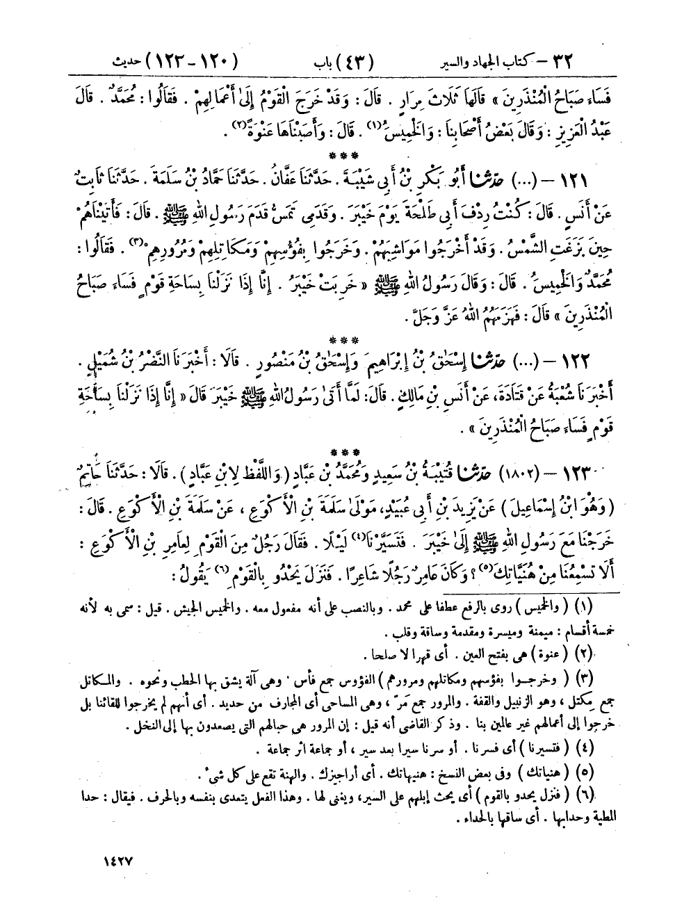 ١٢١ - (١٣٦٥) حَدَّثَنَا أَبُو بَكْرِ بْنُ أَبِي شَيْبَةَ، حَدَّثَنَا عَفَّانُ، حَدَّثَنَا حَمَّادُ بْنُ سَلَمَةَ، حَدَّثَنَا ثَابِتٌ، عَنْ أَنَسٍ، قَالَ: كُنْتُ رِدْفَ أَبِي طَلْحَةَ يَوْمَ خَيْبَرَ وَقَدَمِي تَمَسُّ قَدَمَ رَسُولِ اللهِ صَلَّى اللهُ عَلَيْهِ وَسَلَّمَ، قَالَ: فَأَتَيْنَاهُمْ حِينَ بَزَغَتِ الشَّمْسُ وَقَدْ أَخْرَجُوا مَوَاشِيَهُمْ، وَخَرَجُوا بِفُؤُوسِهِمْ، وَمَكَاتِلِهِمْ، وَمُرُورِهِمْ، فَقَالُوا: مُحَمَّدٌ وَالْخَمِيسَ، قَالَ: وَقَالَ رَسُولُ اللهِ صَلَّى اللهُ عَلَيْهِ وَسَلَّمَ: " خَرِبَتْ خَيْبَرُ، إِنَّا إِذَا نَزَلْنَا بِسَاحَةِ قَوْمٍ {فَسَاءَ صَبَاحُ الْمُنْذَرِينَ} [الصافات: ١٧٧] "، قَالَ: فَهَزَمَهُمُ اللهُ عَزَّ وَجَلَّ