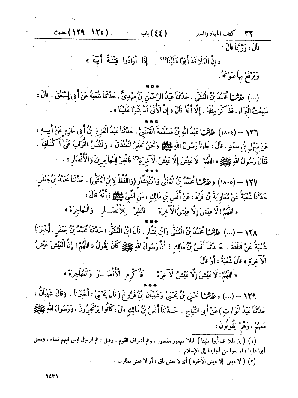 ١٢٧ - (١٨٠٥) وحَدَّثَنَا مُحَمَّدُ بْنُ الْمُثَنَّى، وَابْنُ بَشَّارٍ، وَاللَّفْظُ لِابْنِ الْمُثَنَّى، حَدَّثَنَا مُحَمَّدُ بْنُ جَعْفَرٍ، حَدَّثَنَا شُعْبَةُ، عَنْ مُعَاوِيَةَ بْنِ قُرَّةَ، عَنْ أَنَسِ بْنِ مَالِكٍ، عَنِ النَّبِيِّ صَلَّى اللهُ عَلَيْهِ وَسَلَّمَ أَنَّهُ قَالَ: «اللهُمَّ لَا عَيْشَ إِلَّا عَيْشُ الْآخِرَهْ، فَاغْفِرْ لِلْأَنْصَارِ وَالْمُهَاجِرَهْ»