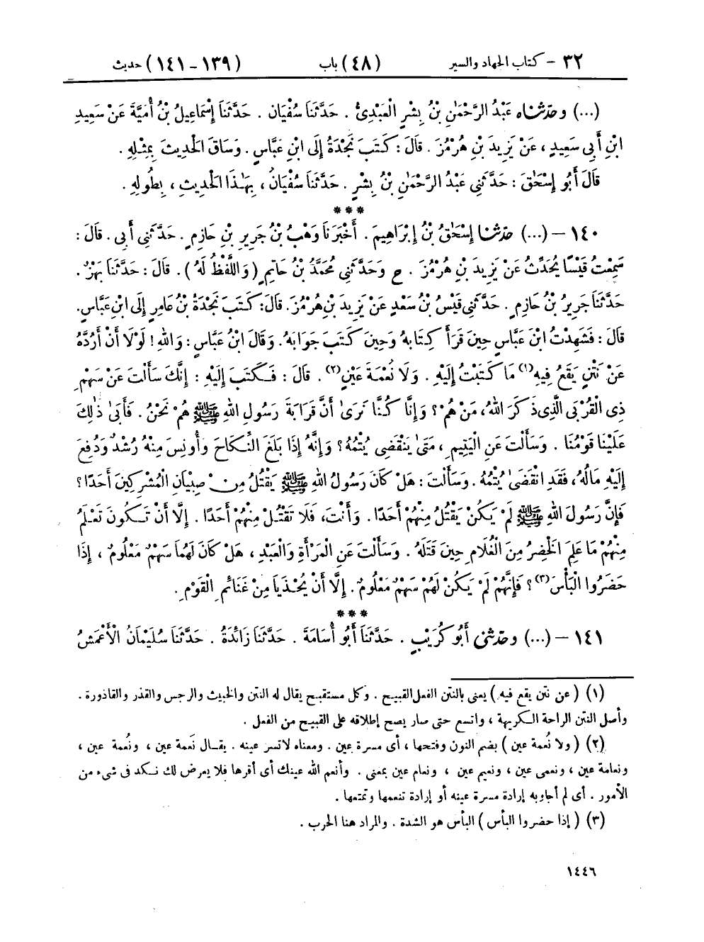 ١٤٠ - (١٨١٢) حَدَّثَنَا إِسْحَاقُ بْنُ إِبْرَاهِيمَ، أَخْبَرَنَا وَهْبُ بْنُ جَرِيرِ بْنِ حَازِمٍ، حَدَّثَنِي أَبِي، قَالَ: سَمِعْتُ قَيْسًا، يُحَدِّثُ عَنْ يَزِيدَ بْنِ هُرْمُزَ، ح وحَدَّثَنِي مُحَمَّدُ بْنُ حَاتِمٍ، وَاللَّفْظُ لَهُ، قَالَ: حَدَّثَنَا بَهْزٌ، حَدَّثَنَا جَرِيرُ بْنُ حَازِمٍ، حَدَّثَنِي قَيْسُ بْنُ سَعْدٍ، عَنْ يَزِيدَ بْنِ هُرْمُزَ، قَالَ: كَتَبَ نَجْدَةُ بْنُ عَامِرٍ إِلَى ابْنِ عَبَّاسٍ، قَالَ: فَشَهِدْتُ ابْنَ عَبَّاسٍ حِينَ قَرَأَ كِتَابَهُ، وَحِينَ كَتَبَ جَوَابَهُ، وَقَالَ ابْنُ عَبَّاسٍ: وَاللهِ لَوْلَا أَنْ أَرُدَّهُ عَنْ نَتْنٍ يَقَعُ فِيهِ مَا كَتَبْتُ إِلَيْهِ، وَلَا نُعْمَةَ عَيْنٍ، قَالَ: فَكَتَبَ إِلَيْهِ: «إِنَّكَ سَأَلْتَ عَنْ سَهْمِ ذِي الْقُرْبَى الَّذِي ذَكَرَ اللهُ مَنْ هُمْ؟ وَإِنَّا كُنَّا نَرَى أَنَّ قَرَابَةَ رَسُولِ اللهِ صَلَّى اللهُ عَلَيْهِ وَسَلَّمَ هُمْ نَحْنُ، فَأَبَى ذَلِكَ عَلَيْنَا قَوْمُنَا، وَسَأَلْتَ عَنِ الْيَتِيمِ مَتَى يَنْقَضِي يُتْمُهُ؟ وَإِنَّهُ إِذَا بَلَغَ النِّكَاحَ، وَأُونِسَ مِنْهُ رُشْدٌ، وَدُفِعَ إِلَيْهِ مَالُهُ، فَقَدِ انْقَضَى يُتْمُهُ، وَسَأَلْتَ هَلْ كَانَ رَسُولُ اللهِ صَلَّى اللهُ عَلَيْهِ وَسَلَّمَ يَقْتُلُ مِنْ صِبْيَانِ الْمُشْرِكِينَ أَحَدًا؟ فَإِنَّ رَسُولَ اللهِ صَلَّى اللهُ عَلَيْهِ وَسَلَّمَ لَمْ يَكُنْ يَقْتُلُ مِنْهُمْ أَحَدًا، وَأَنْتَ فَلَا تَقْتُلْ مِنْهُمْ أَحَدًا، إِلَّا أَنْ تَكُونَ تَعْلَمُ مِنْهُمْ مَا عَلِمَ الْخَضِرُ مِنَ الْغُلَامِ حِينَ قَتَلَهُ، وَسَأَلْتَ عَنِ الْمَرْأَةِ وَالْعَبْدِ هَلْ كَانَ لَهُمَا سَهْمٌ مَعْلُومٌ إِذَا حَضَرُوا الْبَأْسَ؟ فَإِنَّهُمْ لَمْ يَكُنْ لَهُمْ سَهْمٌ مَعْلُومٌ، إِلَّا أَنْ يُحْذَيَا مِنْ غَنَائِمِ الْقَوْمِ»