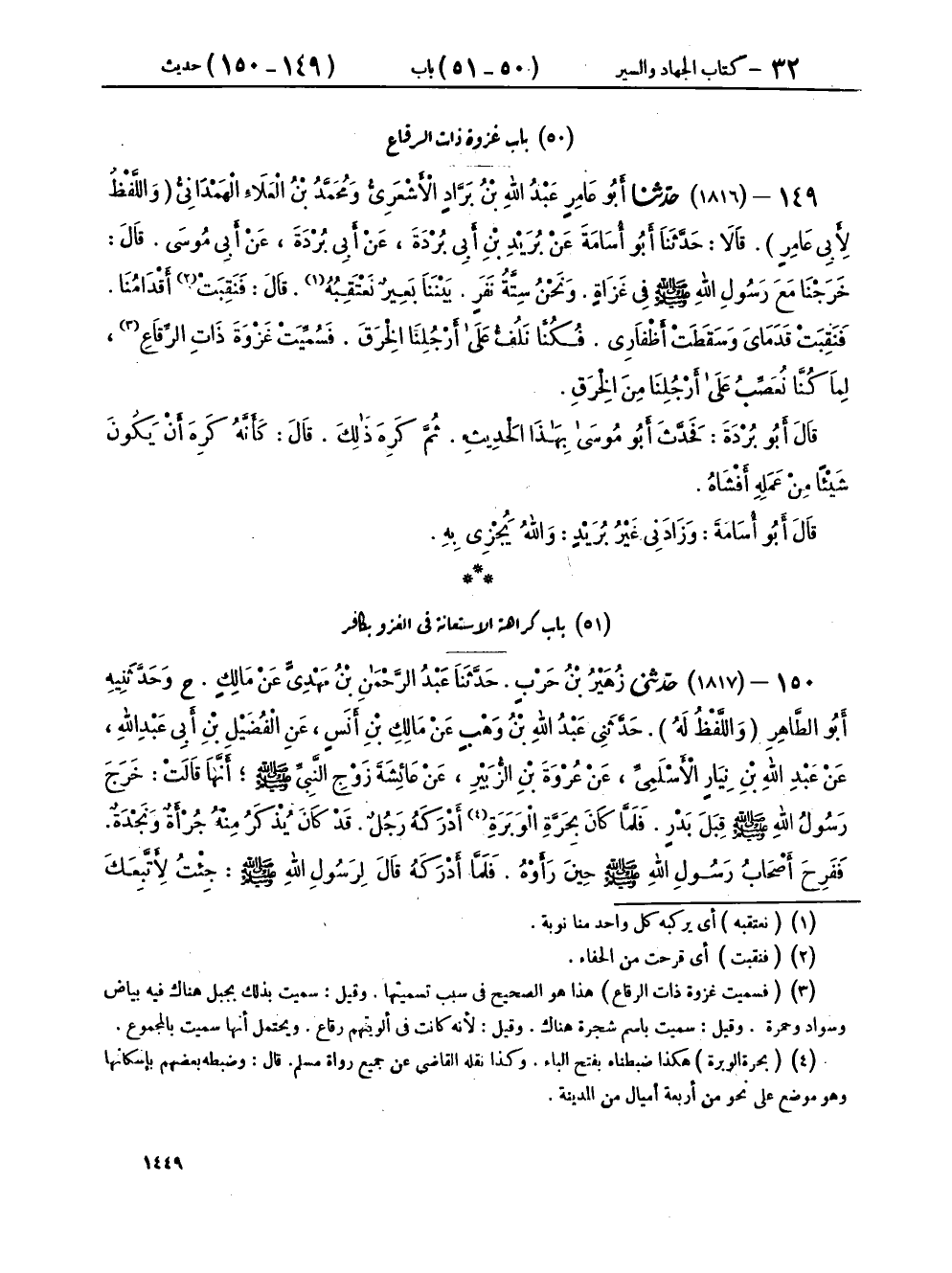 ١٤٩ - (١٨١٦) حَدَّثَنَا أَبُو عَامِرٍ عَبْدُ اللهِ بْنُ بَرَّادٍ الْأَشْعَرِيُّ، وَمُحَمَّدُ بْنُ الْعَلَاءِ الْهَمْدَانِيُّ، وَاللَّفْظُ لِأَبِي عَامِرٍ، قَالَا: حَدَّثَنَا أَبُو أُسَامَةَ، عَنْ بُرَيْدِ بْنِ أَبِي بُرْدَةَ، عَنْ أَبِي بُرْدَةَ، عَنْ أَبِي مُوسَى، قَالَ: «خَرَجْنَا مَعَ رَسُولِ اللهِ صَلَّى اللهُ عَلَيْهِ وَسَلَّمَ فِي غَزَاةٍ وَنَحْنُ سِتَّةُ نَفَرٍ بَيْنَنَا بَعِيرٌ نَعْتَقِبُهُ»، قَالَ: «فَنَقِبَتْ أَقْدَامُنَا، فَنَقِبَتْ قَدَمَايَ، وَسَقَطَتْ أَظْفَارِي، فَكُنَّا نَلُفُّ عَلَى أَرْجُلِنَا الْخِرَقَ، فَسُمِّيَتْ غَزْوَةَ ذَاتِ الرِّقَاعِ لِمَا كُنَّا نُعَصِّبُ عَلَى أَرْجُلِنَا مِنَ الْخِرَقِ»، قَالَ أَبُو بُرْدَةَ فَحَدَّثَ أَبُو مُوسَى بِهَذَا الْحَدِيثِ، ثُمَّ كَرِهَ ذَلِكَ، قَالَ: كَأَنَّهُ كَرِهَ أَنْ يَكُونَ شَيْئًا مِنْ عَمَلِهِ أَفْشَاهُ، قَالَ أَبُو أُسَامَةَ وَزَادَنِي غَيْرُ بُرَيْدٍ وَاللهُ يُجْزِي بِهِ