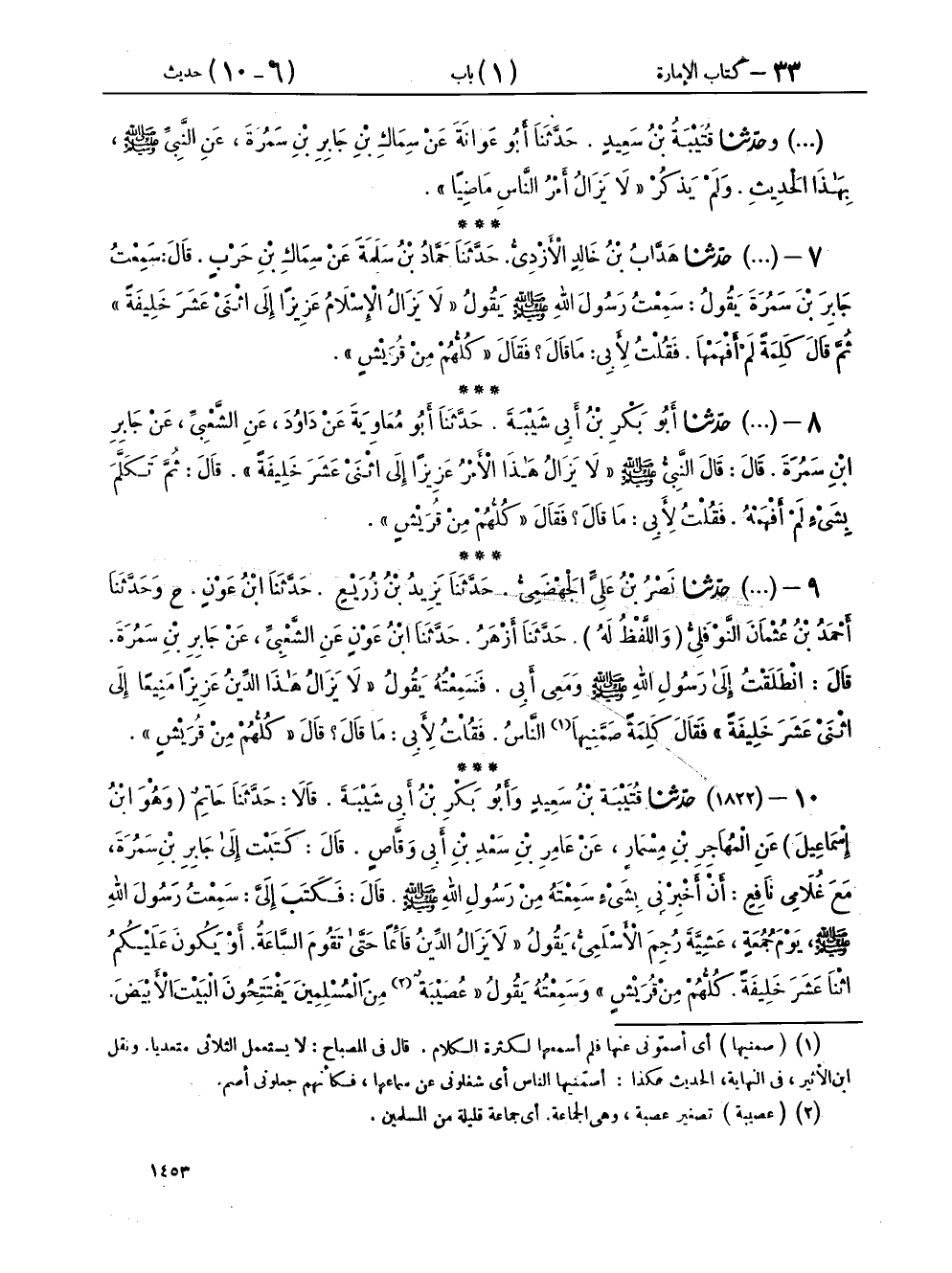 ١٠ - (١٨٢٢) حَدَّثَنَا قُتَيْبَةُ بْنُ سَعِيدٍ، وَأَبُو بَكْرِ بْنُ أَبِي شَيْبَةَ، قَالَا: حَدَّثَنَا حَاتِمٌ وَهُوَ ابْنُ إِسْمَاعِيلَ، عَنِ الْمُهَاجِرِ بْنِ مِسْمَارٍ، عَنْ عَامِرِ بْنِ سَعْدِ بْنِ أَبِي وَقَّاصٍ، قَالَ: كَتَبْتُ إِلَى جَابِرِ بْنِ سَمُرَةَ مَعَ غُلَامِي نَافِعٍ، أَنْ أَخْبِرْنِي بِشَيْءٍ سَمِعْتَهُ مِنْ رَسُولِ اللهِ صَلَّى اللهُ عَلَيْهِ وَسَلَّمَ، قَالَ: فَكَتَبَ إِلَيَّ، سَمِعْتُ رَسُولَ اللهِ صَلَّى اللهُ عَلَيْهِ وَسَلَّمَ يَوْمَ جُمُعَةٍ عَشِيَّةَ رُجِمَ الْأَسْلَمِيُّ يَقُولُ: «لَا يَزَالُ الدِّينُ قَائِمًا حَتَّى تَقُومَ السَّاعَةُ، أَوْ يَكُونَ عَلَيْكُمُ اثْنَا عَشَرَ خَلِيفَةً، كُلُّهُمْ مِنْ قُرَيْشٍ» وَسَمِعْتُهُ يَقُولُ: ": عُصَيْبَةٌ: مِنَ الْمُسْلِمِينَ يَفْتَتِحُونَ الْبَيْتَ الْأَبْيَضَ، بَيْتَ كِسْرَى «أَوْ» آلِ كِسْرَى " وَسَمِعْتُهُ يَقُولُ: «إِنَّ بَيْنَ يَدَيِ السَّاعَةِ كَذَّابِينَ فَاحْذَرُوهُمْ» وَسَمِعْتُهُ يَقُولُ: «إِذَا أَعْطَى اللهُ أَحَدَكُمْ خَيْرًا فَلْيَبْدَأْ بِنَفْسِهِ وَأَهْلِ بَيْتِهِ» وَسَمِعْتُهُ يَقُولُ: «أَنَا الْفَرَطُ عَلَى الْحَوْضِ»،