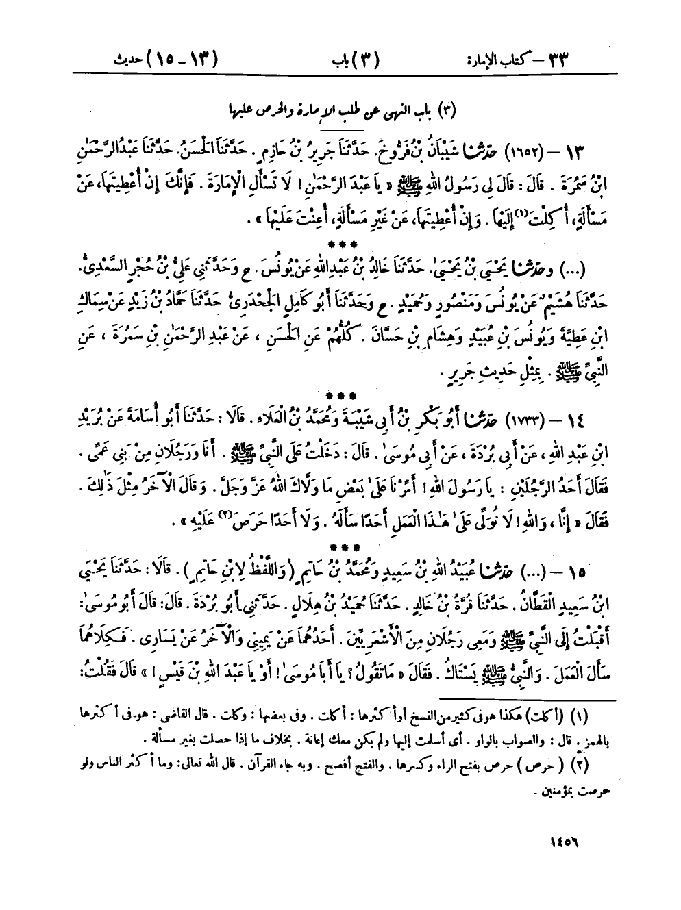 ١٤ - (١٧٣٣) حَدَّثَنَا أَبُو بَكْرِ بْنُ أَبِي شَيْبَةَ، وَمُحَمَّدُ بْنُ الْعَلَاءِ، قَالَا: حَدَّثَنَا أَبُو أُسَامَةَ، عَنْ بُرَيْدِ بْنِ عَبْدِ اللهِ، عَنْ أَبِي بُرْدَةَ، عَنْ أَبِي مُوسَى، قَالَ: دَخَلْتُ عَلَى النَّبِيِّ صَلَّى اللهُ عَلَيْهِ وَسَلَّمَ أَنَا وَرَجُلَانِ مِنْ بَنِي عَمِّي، فَقَالَ أَحَدُ الرَّجُلَيْنِ: يَا رَسُولَ اللهِ، أَمِّرْنَا عَلَى بَعْضِ مَا وَلَّاكَ اللهُ عَزَّ وَجَلَّ، وَقَالَ الْآخَرُ مِثْلَ ذَلِكَ، فَقَالَ: «إِنَّا وَاللهِ لَا نُوَلِّي عَلَى هَذَا الْعَمَلِ أَحَدًا سَأَلَهُ، وَلَا أَحَدًا حَرَصَ عَلَيْهِ»