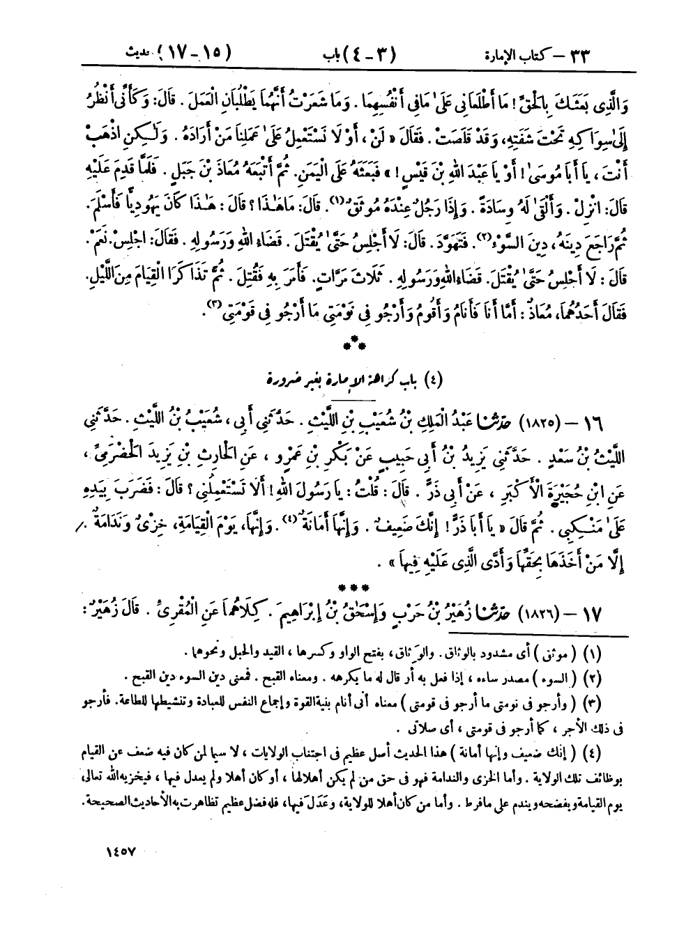 ١٧ - (١٨٢٦) حَدَّثَنَا زُهَيْرُ بْنُ حَرْبٍ، وَإِسْحَاقُ بْنُ إِبْرَاهِيمَ، كِلَاهُمَا عَنِ الْمُقْرِئِ، قَالَ زُهَيْرٌ: حَدَّثَنَا عَبْدُ اللهِ بْنُ يَزِيدَ، حَدَّثَنَا سَعِيدُ بْنُ أَبِي أَيُّوبَ، عَنْ عُبَيْدِ اللهِ بْنِ أَبِي جَعْفَرٍ الْقُرَشِيِّ، عَنْ سَالِمِ بْنِ أَبِي سَالِمٍ الْجَيْشَانِيِّ، عَنْ أَبِيهِ، عَنْ أَبِي ذَرٍّ، أَنَّ رَسُولَ اللهِ صَلَّى اللهُ عَلَيْهِ وَسَلَّمَ، قَالَ: «يَا أَبَا ذَرٍّ، إِنِّي أَرَاكَ ضَعِيفًا، وَإِنِّي أُحِبُّ لَكَ مَا أُحِبُّ لِنَفْسِي، لَا تَأَمَّرَنَّ عَلَى اثْنَيْنِ، وَلَا تَوَلَّيَنَّ مَالَ يَتِيمٍ»