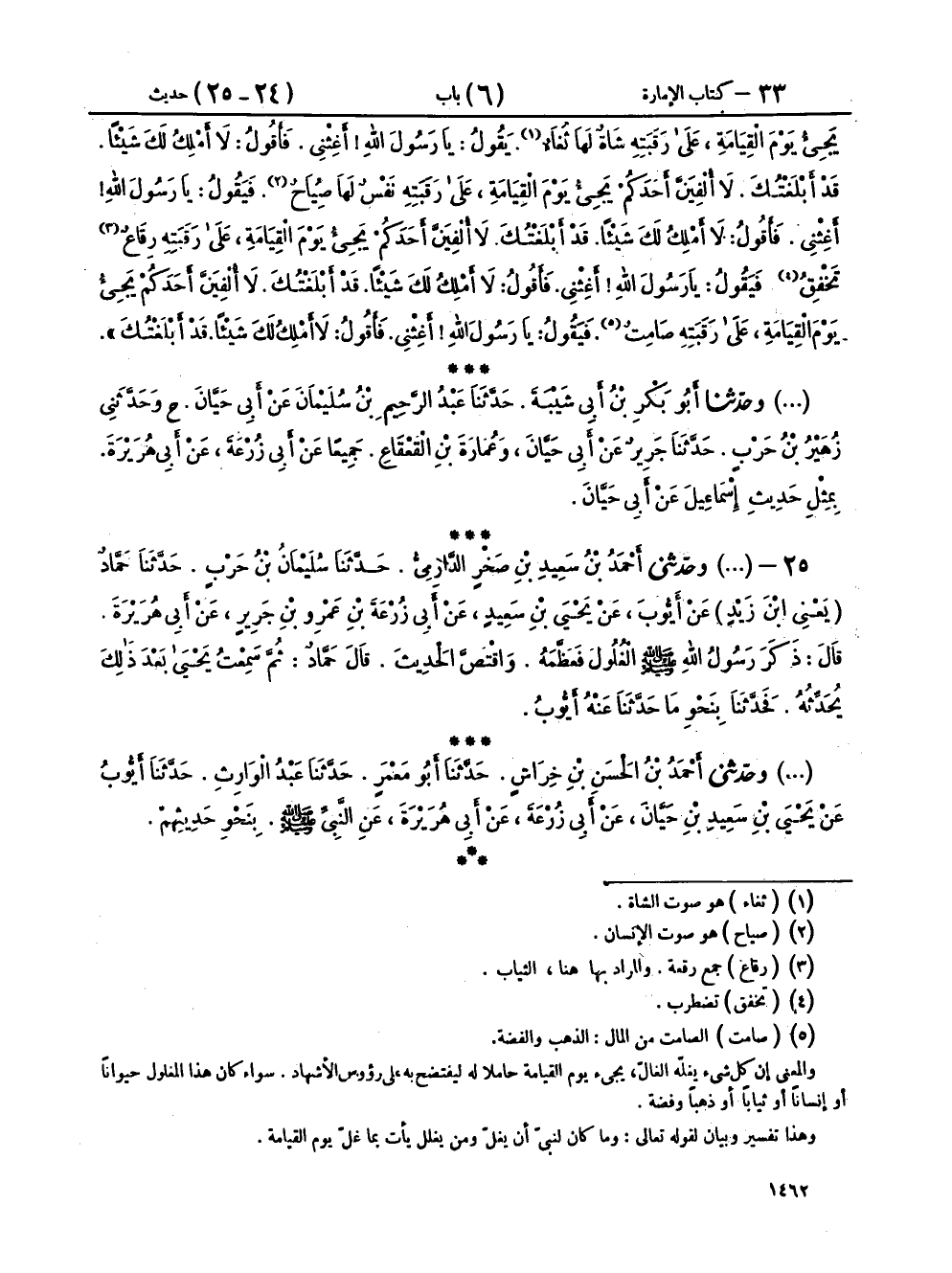 ٢٥ - (١٨٣١) وحَدَّثَنِي أَحْمَدُ بْنُ سَعِيدِ بْنِ صَخْرٍ الدَّارِمِيُّ، حَدَّثَنَا سُلَيْمَانُ بْنُ حَرْبٍ، حَدَّثَنَا حَمَّادٌ يَعْنِي ابْنَ زَيْدٍ، عَنْ أَيُّوبَ، عَنْ يَحْيَى بْنِ سَعِيدٍ، عَنْ أَبِي زُرْعَةَ بْنِ عَمْرِو بْنِ جَرِيرٍ، عَنْ أَبِي هُرَيْرَةَ، قَالَ: ذَكَرَ رَسُولُ اللهِ صَلَّى اللهُ عَلَيْهِ وَسَلَّمَ الْغُلُولَ، فَعَظَّمَهُ، وَاقْتَصَّ الْحَدِيثَ، قَالَ حَمَّادٌ: ثُمَّ سَمِعْتُ يَحْيَى بَعْدَ ذَلِكَ يُحَدِّثُهُ، فَحَدَّثَنَا بِنَحْوِ مَا حَدَّثَنَا عَنْهُ أَيُّوبُ،