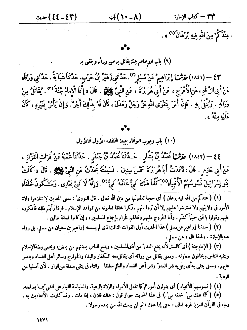 ٤٤ - (١٨٤٢) حَدَّثَنَا مُحَمَّدُ بْنُ بَشَّارٍ، حَدَّثَنَا مُحَمَّدُ بْنُ جَعْفَرٍ، حَدَّثَنَا شُعْبَةُ، عَنْ فُرَاتٍ الْقَزَّازِ، عَنْ أَبِي حَازِمٍ، قَالَ: قَاعَدْتُ أَبَا هُرَيْرَةَ خَمْسَ سِنِينَ فَسَمِعْتُهُ يُحَدِّثُ، عَنِ النَّبِيِّ صَلَّى اللهُ عَلَيْهِ وَسَلَّمَ، قَالَ: «كَانَتْ بَنُو إِسْرَائِيلَ تَسُوسُهُمُ الْأَنْبِيَاءُ، كُلَّمَا هَلَكَ نَبِيٌّ خَلَفَهُ نَبِيٌّ، وَإِنَّهُ لَا نَبِيَّ بَعْدِي، وَسَتَكُونُ خُلَفَاءُ فَتَكْثُرُ»، قَالُوا: فَمَا تَأْمُرُنَا؟ قَالَ: «فُوا بِبَيْعَةِ الْأَوَّلِ، فَالْأَوَّلِ، وَأَعْطُوهُمْ حَقَّهُمْ، فَإِنَّ اللهَ سَائِلُهُمْ عَمَّا اسْتَرْعَاهُمْ»،
