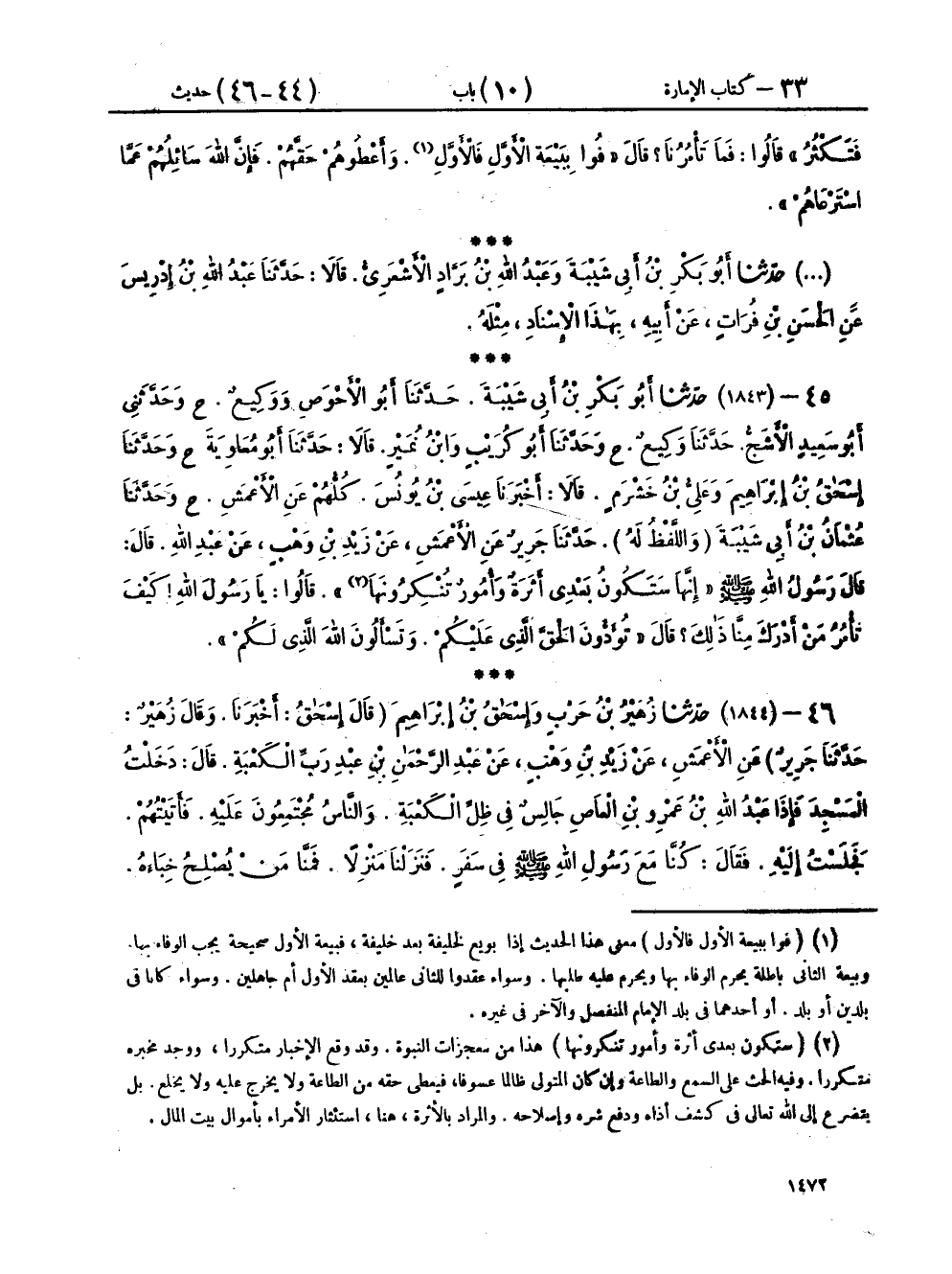 ٤٥ - (١٨٤٣) حَدَّثَنَا أَبُو بَكْرِ بْنُ أَبِي شَيْبَةَ، حَدَّثَنَا أَبُو الْأَحْوَصِ، وَوَكِيعٌ، ح وحَدَّثَنِي أَبُو سَعِيدٍ الْأَشَجُّ، حَدَّثَنَا وَكِيعٌ، ح وحَدَّثَنَا أَبُو كُرَيْبٍ، وَابْنُ نُمَيْرٍ، قَالَا: حَدَّثَنَا أَبُو مُعَاوِيَةَ، ح وحَدَّثَنَا إِسْحَاقُ بْنُ إِبْرَاهِيمَ، وَعَلِيُّ بْنُ خَشْرَمٍ، قَالَا: أَخْبَرَنَا عِيسَى بْنُ يُونُسَ، كُلُّهُمْ عَنِ الْأَعْمَشِ، ح وحَدَّثَنَا عُثْمَانُ بْنُ أَبِي شَيْبَةَ، وَاللَّفْظُ لَهُ، حَدَّثَنَا جَرِيرٌ، عَنِ الْأَعْمَشِ، عَنْ زَيْدِ بْنِ وَهْبٍ، عَنْ عَبْدِ اللهِ، قَالَ: قَالَ رَسُولُ اللهِ صَلَّى اللهُ عَلَيْهِ وَسَلَّمَ: «إِنَّهَا سَتَكُونُ بَعْدِي أَثَرَةٌ وَأُمُورٌ تُنْكِرُونَهَا»، قَالُوا: يَا رَسُولَ اللهِ، كَيْفَ تَأْمُرُ مَنْ أَدْرَكَ مِنَّا ذَلِكَ؟ قَالَ: «تُؤَدُّونَ الْحَقَّ الَّذِي عَلَيْكُمْ، وَتَسْأَلُونَ اللهَ الَّذِي لَكُمْ»