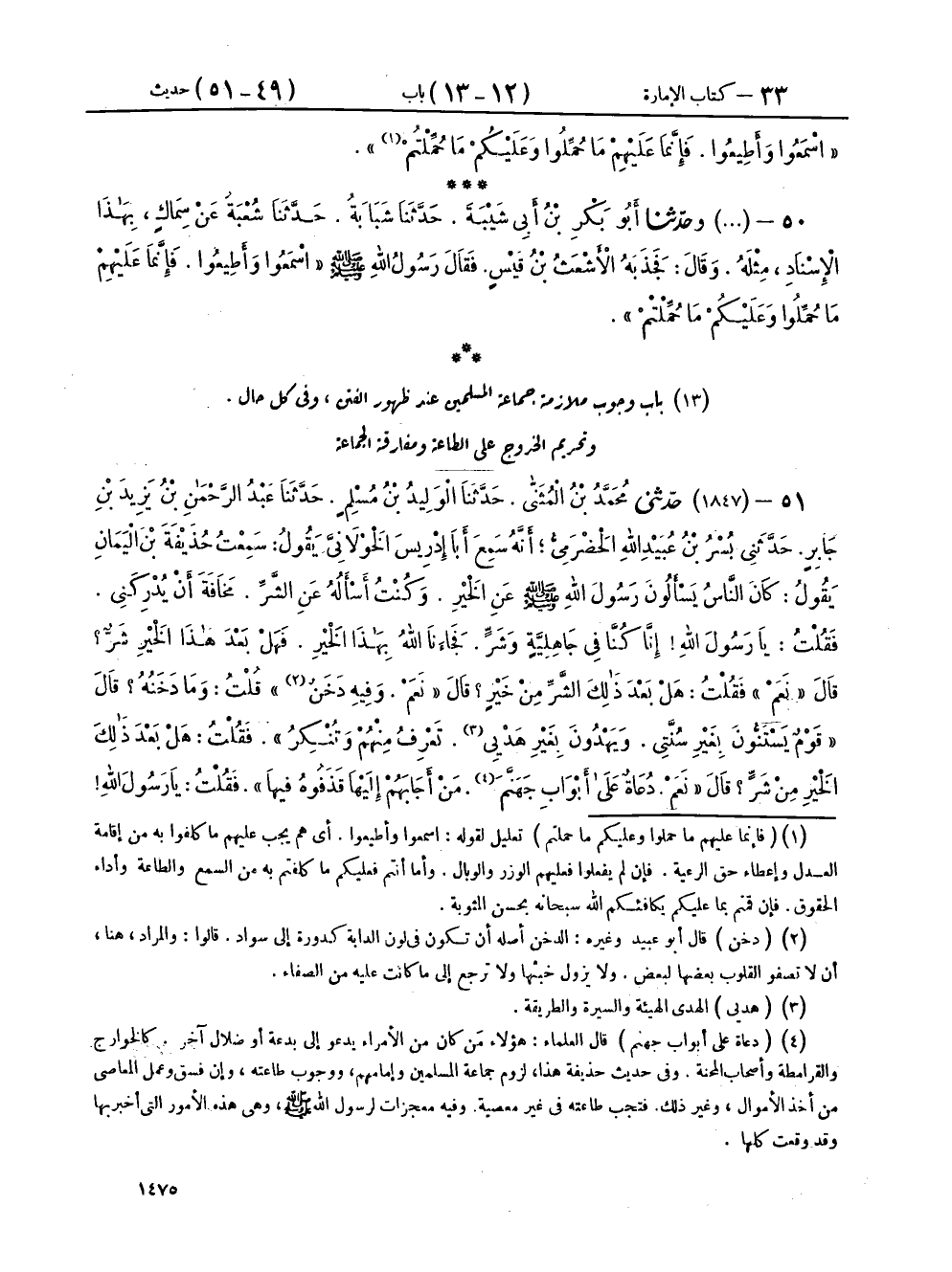 ٥١ - (١٨٤٧) حَدَّثَنِي مُحَمَّدُ بْنُ الْمُثَنَّى، حَدَّثَنَا الْوَلِيدُ بْنُ مُسْلِمٍ، حَدَّثَنَا عَبْدُ الرَّحْمَنِ بْنُ يَزِيدَ بْنِ جَابِرٍ، حَدَّثَنِي بُسْرُ بْنُ عُبَيْدِ اللهِ الْحَضْرَمِيُّ، أَنَّهُ سَمِعَ أَبَا إِدْرِيسَ الْخَوْلَانِيَّ، يَقُولُ: سَمِعْتُ حُذَيْفَةَ بْنَ الْيَمَانِ، يَقُولُ: كَانَ النَّاسُ يَسْأَلُونَ رَسُولَ اللهِ صَلَّى اللهُ عَلَيْهِ وَسَلَّمَ عَنِ الْخَيْرِ، وَكُنْتُ أَسْأَلُهُ عَنِ الشَّرِّ مَخَافَةَ أَنْ يُدْرِكَنِي، فَقُلْتُ: يَا رَسُولَ اللهِ، إِنَّا كُنَّا فِي جَاهِلِيَّةٍ وَشَرٍّ، فَجَاءَنَا اللهُ بِهَذَا الْخَيْرِ، فَهَلْ بَعْدَ هَذَا الْخَيْرِ شَرٌّ؟ قَالَ: «نَعَمْ»، فَقُلْتُ: هَلْ بَعْدَ ذَلِكَ الشَّرِّ مِنْ خَيْرٍ؟ قَالَ: «نَعَمْ، وَفِيهِ دَخَنٌ»، قُلْتُ: وَمَا دَخَنُهُ؟ قَالَ: «قَوْمٌ يَسْتَنُّونَ بِغَيْرِ سُنَّتِي، وَيَهْدُونَ بِغَيْرِ هَدْيِي، تَعْرِفُ مِنْهُمْ وَتُنْكِرُ»، فَقُلْتُ: هَلْ بَعْدَ ذَلِكَ الْخَيْرِ مِنْ شَرٍّ؟ قَالَ: «نَعَمْ، دُعَاةٌ عَلَى أَبْوَابِ جَهَنَّمَ مَنْ أَجَابَهُمْ إِلَيْهَا قَذَفُوهُ فِيهَا»، فَقُلْتُ: يَا رَسُولَ اللهِ، صِفْهُمْ لَنَا، قَالَ: «نَعَمْ، قَوْمٌ مِنْ جِلْدَتِنَا، وَيَتَكَلَّمُونَ بِأَلْسِنَتِنَا»، قُلْتُ: يَا رَسُولَ اللهِ، فَمَا تَرَى إِنْ أَدْرَكَنِي ذَلِكَ؟ قَالَ: «تَلْزَمُ جَمَاعَةَ الْمُسْلِمِينَ وَإِمَامَهُمْ»، فَقُلْتُ: فَإِنْ لَمْ تَكُنْ لَهُمْ جَمَاعَةٌ وَلَا إِمَامٌ؟ قَالَ: «فَاعْتَزِلْ تِلْكَ الْفِرَقَ كُلَّهَا، وَلَوْ أَنْ تَعَضَّ عَلَى أَصْلِ شَجَرَةٍ حَتَّى يُدْرِكَكَ الْمَوْتُ وَأَنْتَ عَلَى ذَلِكَ»