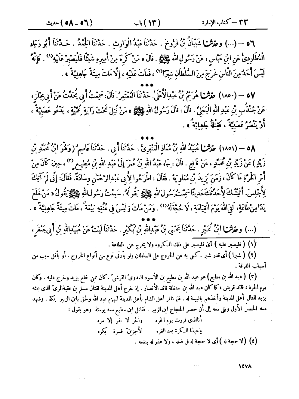 ٥٨ - (١٨٥١) حَدَّثَنَا عُبَيْدُ اللهِ بْنُ مُعَاذٍ الْعَنْبَرِيُّ، حَدَّثَنَا أَبِي، حَدَّثَنَا عَاصِمٌ وَهُوَ ابْنُ مُحَمَّدِ بْنِ زَيْدٍ، عَنْ زَيْدِ بْنِ مُحَمَّدٍ، عَنْ نَافِعٍ، قَالَ: جَاءَ عَبْدُ اللهِ بْنُ عُمَرَ إِلَى عَبْدِ اللهِ بْنِ مُطِيعٍ حِينَ كَانَ مِنْ أَمْرِ الْحَرَّةِ مَا كَانَ، زَمَنَ يَزِيدَ بْنِ مُعَاوِيَةَ، فَقَالَ: اطْرَحُوا لِأَبِي عَبْدِ الرَّحْمَنِ وِسَادَةً، فَقَالَ: إِنِّي لَمْ آتِكَ لِأَجْلِسَ، أَتَيْتُكَ لِأُحَدِّثَكَ حَدِيثًا سَمِعْتُ رَسُولَ اللهِ صَلَّى اللهُ عَلَيْهِ وَسَلَّمَ يَقُولُهُ: سَمِعْتُ رَسُولَ اللهِ صَلَّى اللهُ عَلَيْهِ وَسَلَّمَ يَقُولُ: «مَنْ خَلَعَ يَدًا مِنْ طَاعَةٍ، لَقِيَ اللهَ يَوْمَ الْقِيَامَةِ لَا حُجَّةَ لَهُ، وَمَنْ مَاتَ وَلَيْسَ فِي عُنُقِهِ بَيْعَةٌ، مَاتَ مِيتَةً جَاهِلِيَّةً»
