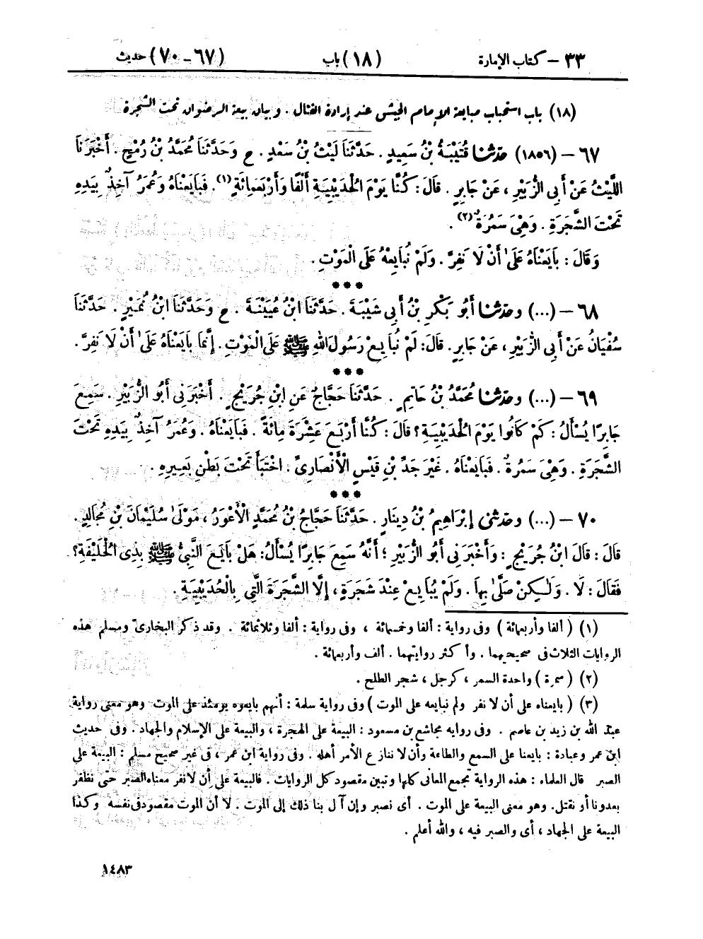 ٦٧ - (١٨٥٦) حَدَّثَنَا قُتَيْبَةُ بْنُ سَعِيدٍ، حَدَّثَنَا لَيْثُ بْنُ سَعْدٍ، ح وحَدَّثَنَا مُحَمَّدُ بْنُ رُمْحٍ، أَخْبَرَنَا اللَّيْثُ، عَنْ أَبِي الزُّبَيْرِ، عَنْ جَابِرٍ، قَالَ: كُنَّا يَوْمَ الْحُدَيْبِيَةِ أَلْفًا وَأَرْبَعَ مِائَةً، فَبَايَعْنَاهُ وَعُمَرُ آخِذٌ بِيَدِهِ تَحْتَ الشَّجَرَةِ، وَهِيَ سَمُرَةٌ، وَقَالَ: «بَايَعْنَاهُ عَلَى أَنْ لَا نَفِرَّ، وَلَمْ نُبَايِعْهُ عَلَى الْمَوْتِ»