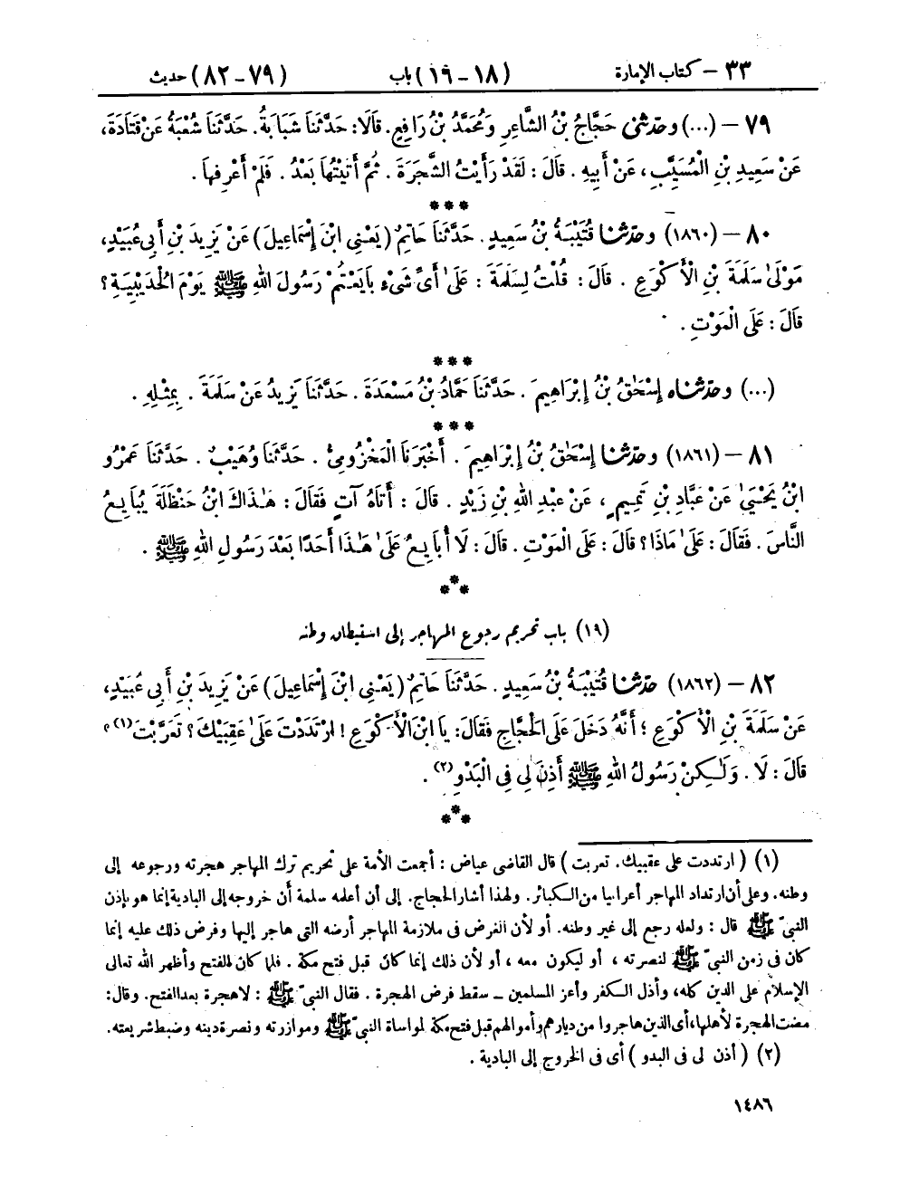 ٨٢ - (١٨٦٢) حَدَّثَنَا قُتَيْبَةُ بْنُ سَعِيدٍ، حَدَّثَنَا حَاتِمٌ يَعْنِي ابْنَ إِسْمَاعِيلَ، عَنْ يَزِيدَ بْنِ أَبِي عُبَيْدٍ، عَنْ سَلَمَةَ بْنِ الْأَكْوَعِ، أَنَّهُ دَخَلَ عَلَى الْحَجَّاجِ، فَقَالَ: يَا ابْنَ الْأَكْوَعِ، ارْتَدَدْتَ عَلَى عَقِبَيْكَ؟ تَعَرَّبْتَ؟ قَالَ: «لَا، وَلَكِنْ رَسُولُ اللهِ صَلَّى اللهُ عَلَيْهِ وَسَلَّمَ أَذِنَ لِي فِي الْبَدْوِ»