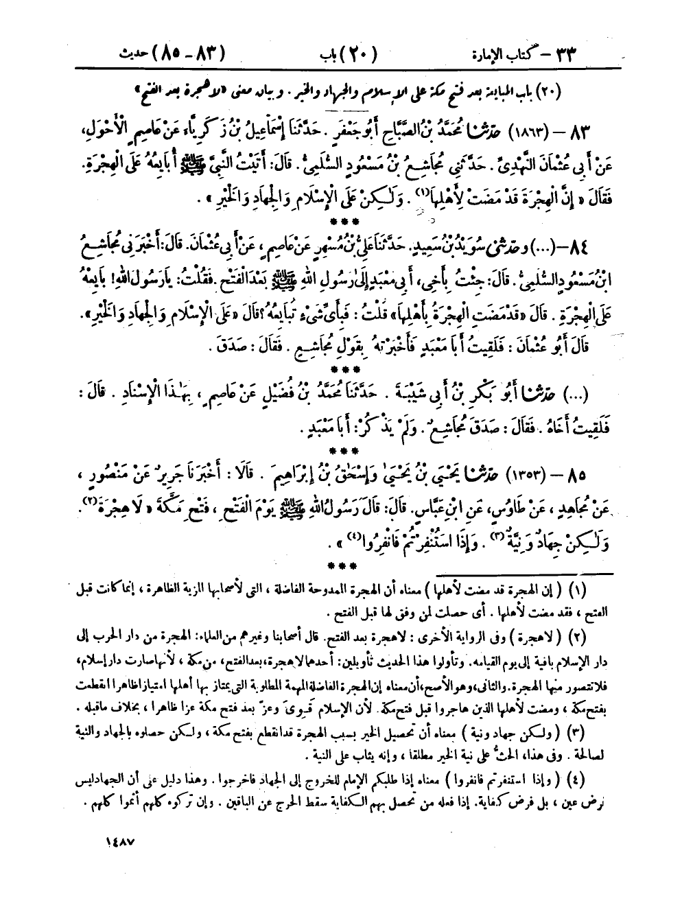 ٨٥ - (١٣٥٣) حَدَّثَنَا يَحْيَى بْنُ يَحْيَى، وَإِسْحَاقُ بْنُ إِبْرَاهِيمَ قَالَا: أَخْبَرَنَا جَرِيرٌ، عَنْ مَنْصُورٍ، عَنْ مُجَاهِدٍ، عَنْ طَاوُسٍ، عَنِ ابْنِ عَبَّاسٍ، قَالَ: قَالَ رَسُولُ اللهِ صَلَّى اللهُ عَلَيْهِ وَسَلَّمَ يَوْمَ الْفَتْحِ - فَتْحِ مَكَّةَ - «لَا هِجْرَةَ، وَلَكِنْ جِهَادٌ وَنِيَّةٌ، وَإِذَا اسْتُنْفِرْتُمْ فَانْفِرُوا»،
