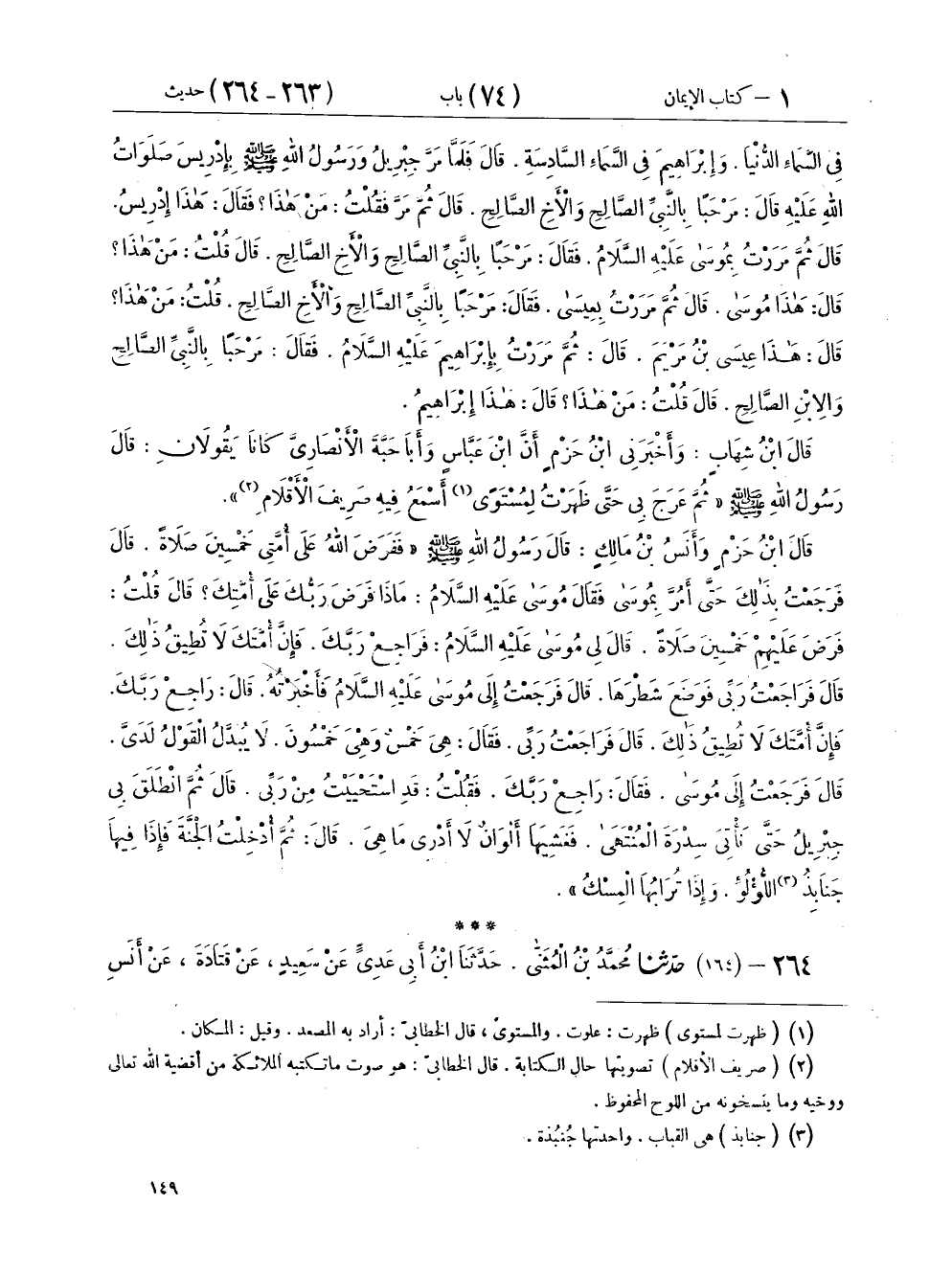 ٢٦٤ - (١٦٤) حَدَّثَنَا مُحَمَّدُ بْنُ الْمُثَنَّى، حَدَّثَنَا ابْنُ أَبِي عَدِيٍّ، عَنْ سَعِيدٍ، عَنْ قَتَادَةَ، عَنْ أَنَسِ ⦗١٥٠⦘ بْنِ مَالِكٍ، لَعَلَّهُ قَالَ: عَنْ مَالِكِ بْنِ صَعْصَعَةَ، رَجُلٍ مِنْ قَوْمِهِ قَالَ: قَالَ نَبِيُّ اللهِ صَلَّى اللهُ عَلَيْهِ وَسَلَّمَ: " بَيْنَا أَنَا عِنْدَ الْبَيْتِ بَيْنَ النَّائِمِ وَالْيَقْظَانِ، إِذْ سَمِعْتُ قَائِلًا يَقُولُ: أَحَدُ الثَّلَاثَةِ بَيْنَ الرَّجُلَيْنِ، فَأُتِيتُ فَانْطُلِقَ بِي، فَأُتِيتُ بِطَسْتٍ مِنْ ذَهَبٍ فِيهَا مِنْ مَاءِ زَمْزَمَ، فَشُرِحَ صَدْرِي إِلَى كَذَا وَكَذَا - قَالَ قَتَادَةُ: فَقُلْتُ لِلَّذِي مَعِي مَا يَعْنِي قَالَ: إِلَى أَسْفَلِ بَطْنِهِ - فَاسْتُخْرِجَ قَلْبِي، فَغُسِلَ بِمَاءِ زَمْزَمَ، ثُمَّ أُعِيدَ مَكَانَهُ، ثُمَّ حُشِيَ إِيمَانًا وَحِكْمَةً، ثُمَّ أُتِيتُ بِدَابَّةٍ أَبْيَضَ، يُقَالُ لَهُ: الْبُرَاقُ، فَوْقَ الْحِمَارِ، وَدُونَ الْبَغْلِ، يَقَعُ خَطْوُهُ عِنْدَ أَقْصَى طَرْفِهِ، فَحُمِلْتُ عَلَيْهِ، ثُمَّ انْطَلَقْنَا حَتَّى أَتَيْنَا السَّمَاءَ الدُّنْيَا، فَاسْتَفْتَحَ جِبْرِيلُ صَلَّى اللهُ عَلَيْهِ وَسَلَّمَ، فَقِيلَ: مَنْ هَذَا؟ قَالَ: جِبْرِيلُ، قِيلَ: وَمَنْ مَعَكَ؟ قَالَ: مُحَمَّدٌ صَلَّى اللهُ عَلَيْهِ وَسَلَّمَ، قِيلَ: وَقَدْ بُعِثَ إِلَيْهِ؟ قَالَ: نَعَمْ، قَالَ: فَفَتَحَ لَنَا، وَقَالَ: مَرْحَبًا بِهِ وَلَنِعْمَ الْمَجِيءُ جَاءَ "، قَالَ: «فَأَتَيْنَا عَلَى آدَمَ صَلَّى اللهُ عَلَيْهِ وَسَلَّمَ»، وَسَاقَ الْحَدِيثَ بِقِصَّتِهِ، وَذَكَرَ أَنَّهُ «لَقِيَ فِي السَّمَاءِ الثَّانِيَةِ عِيسَى، وَيَحْيَى عَلَيْهِمَا السَّلَامُ، وَفِي الثَّالِثَةِ يُوسُفَ، وَفِي الرَّابِعَةِ إِدْرِيسَ، وَفِي الْخَامِسَةِ هَارُونَ صَلَّى اللهُ عَلَيْهِ وَسَلَّمَ»، قَالَ: " ثُمَّ انْطَلَقْنَا حَتَّى انْتَهَيْنَا إِلَى السَّمَاءِ السَّادِسَةِ، فَأَتَيْتُ عَلَى مُوسَى عَلَيْهِ السَّلَامُ، فَسَلَّمْتُ عَلَيْهِ، فَقَالَ: مَرْحَبًا بِالْأَخِ الصَّالِحِ وَالنَّبِيِّ الصَّالِحِ، فَلَمَّا جَاوَزْتُهُ بَكَى، فَنُودِيَ: مَا يُبْكِيكَ؟ قَالَ: رَبِّ، هَذَا غُلَامٌ بَعَثْتَهُ بَعْدِي يَدْخُلُ مِنْ أُمَّتِهِ الْجَنَّةَ أَكْثَرُ مِمَّا يَدْخُلُ مِنْ أُمَّتِي "، قَالَ: «ثُمَّ انْطَلَقْنَا حَتَّى انْتَهَيْنَا إِلَى السَّمَاءِ السَّابِعَةِ، فَأَتَيْتُ عَلَى إِبْرَاهِيمَ»، وَقَالَ فِي الْحَدِيثِ: وَحَدَّثَ نَبِيُّ اللهِ صَلَّى اللهُ عَلَيْهِ وَسَلَّمَ، " أَنَّهُ رَأَى أَرْبَعَةَ أَنْهَارٍ يَخْرُجُ مِنْ أَصْلِهَا نَهْرَانِ ظَاهِرَانِ، وَنَهْرَانِ بَاطِنَانِ، فَقُلْتُ: يَا جِبْرِيلُ، مَا هَذِهِ الْأَنْهَارُ؟ قَالَ: أَمَّا النَّهْرَانِ الْبَاطِنَانِ فَنَهْرَانِ فِي الْجَنَّةِ، وَأَمَّا الظَّاهِرَانِ: فَالنِّيلُ وَالْفُرَاتُ، ثُمَّ رُفِعَ لِي الْبَيْتُ الْمَعْمُورُ، فَقُلْتُ: يَا جِبْرِيلُ مَا هَذَا؟ قَالَ: هَذَا الْبَيْتُ الْمَعْمُورُ يَدْخُلُهُ كُلَّ يَوْمٍ سَبْعُونَ أَلْفَ مَلَكٍ، إِذَا خَرَجُوا مِنْهُ لَمْ يَعُودُوا فِيهِ آخِرُ مَا عَلَيْهِمْ، ثُمَّ أُتِيتُ بِإِنَاءَيْنِ أَحَدُهُمَا خَمْرٌ، وَالْآخَرُ لَبَنٌ، فَعُرِضَا عَلَيَّ فَاخْتَرْتُ اللَّبَنَ، فَقِيلَ: أَصَبْتَ أَصَابَ اللهُ بِكَ أُمَّتُكَ عَلَى الْفِطْرَةِ، ثُمَّ فُرِضَتْ عَلَيَّ كُلَّ يَوْمٍ خَمْسُونَ صَلَاةً "، ثُمَّ ذَكَرَ قِصَّتَهَا إِلَى آخِرِ الْحَدِيثِ،
