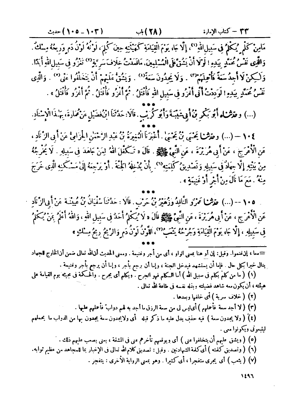 ١٠٥ - (١٨٧٦) حَدَّثَنَا عَمْرٌو النَّاقِدُ، وَزُهَيْرُ بْنُ حَرْبٍ، قَالَا: حَدَّثَنَا سُفْيَانُ بْنُ عُيَيْنَةَ، عَنْ أَبِي الزِّنَادِ، عَنِ الْأَعْرَجِ، عَنْ أَبِي هُرَيْرَةَ، عَنِ النَّبِيِّ صَلَّى اللهُ عَلَيْهِ وَسَلَّمَ، قَالَ: «لَا يُكْلَمُ أَحَدٌ فِي سَبِيلِ اللهِ، وَاللهُ أَعْلَمُ بِمَنْ يُكْلَمُ فِي سَبِيلِهِ، إِلَّا جَاءَ يَوْمَ الْقِيَامَةِ وَجُرْحُهُ يَثْعَبُ، اللَّوْنُ لَوْنُ دَمٍ، وَالرِّيحُ رِيحُ مِسْكٍ»